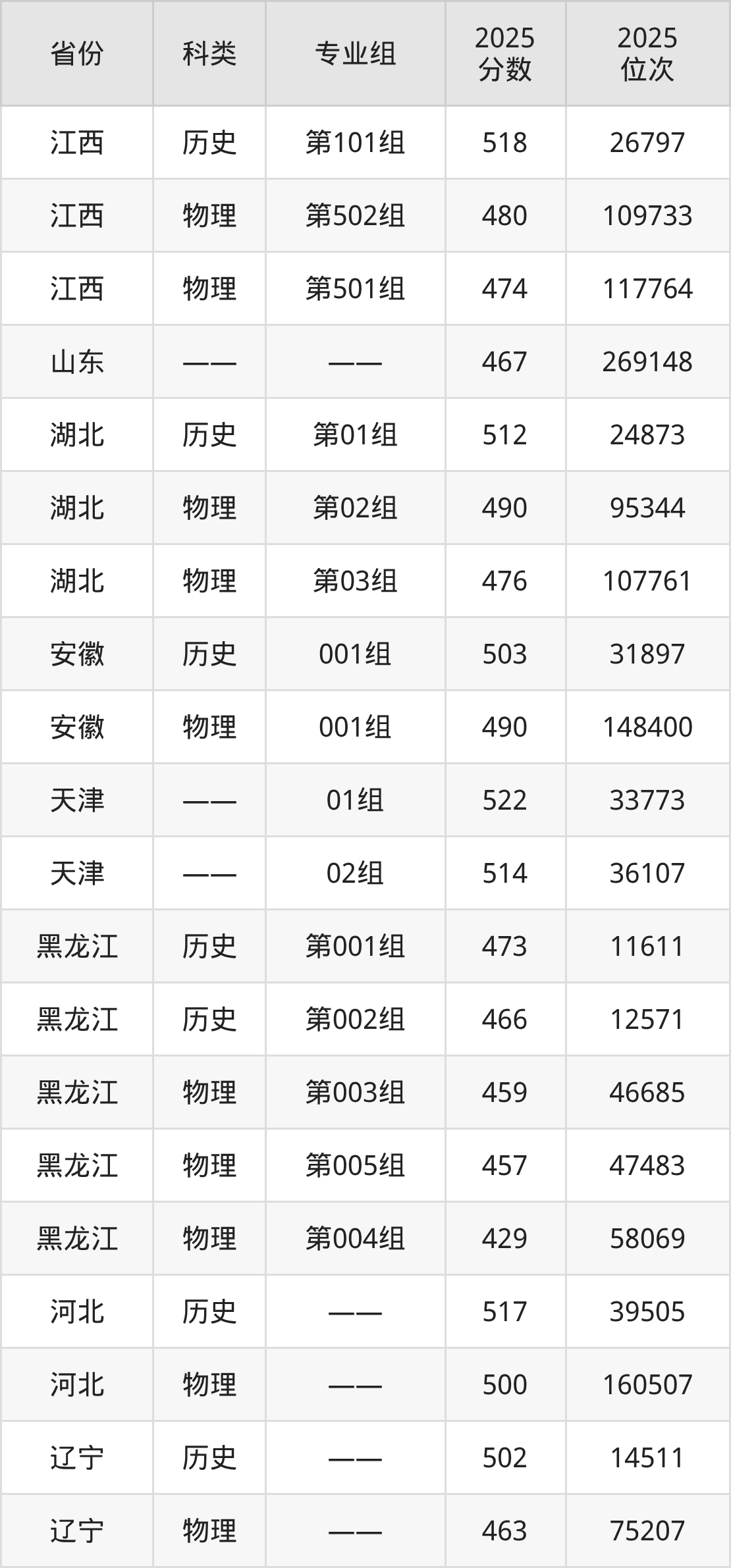 4、黑龙江:最低分429分,对应最低分专业组为物理类第004组,位次58069名;