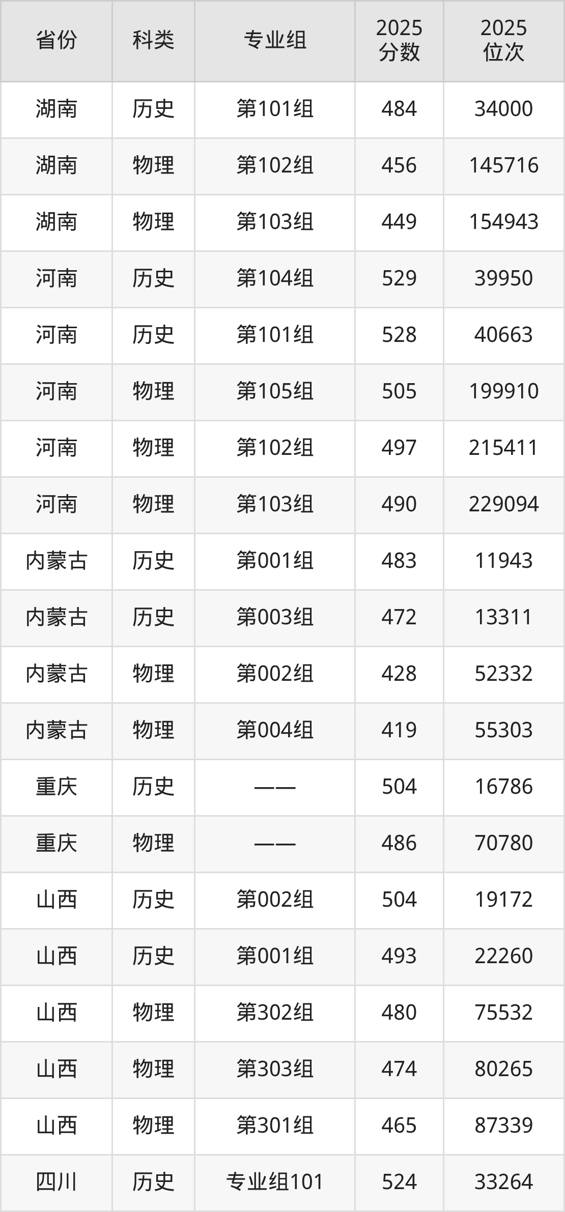 3、内蒙古:最低分419分,对应最低分专业组为物理类第004组,位次55303名;