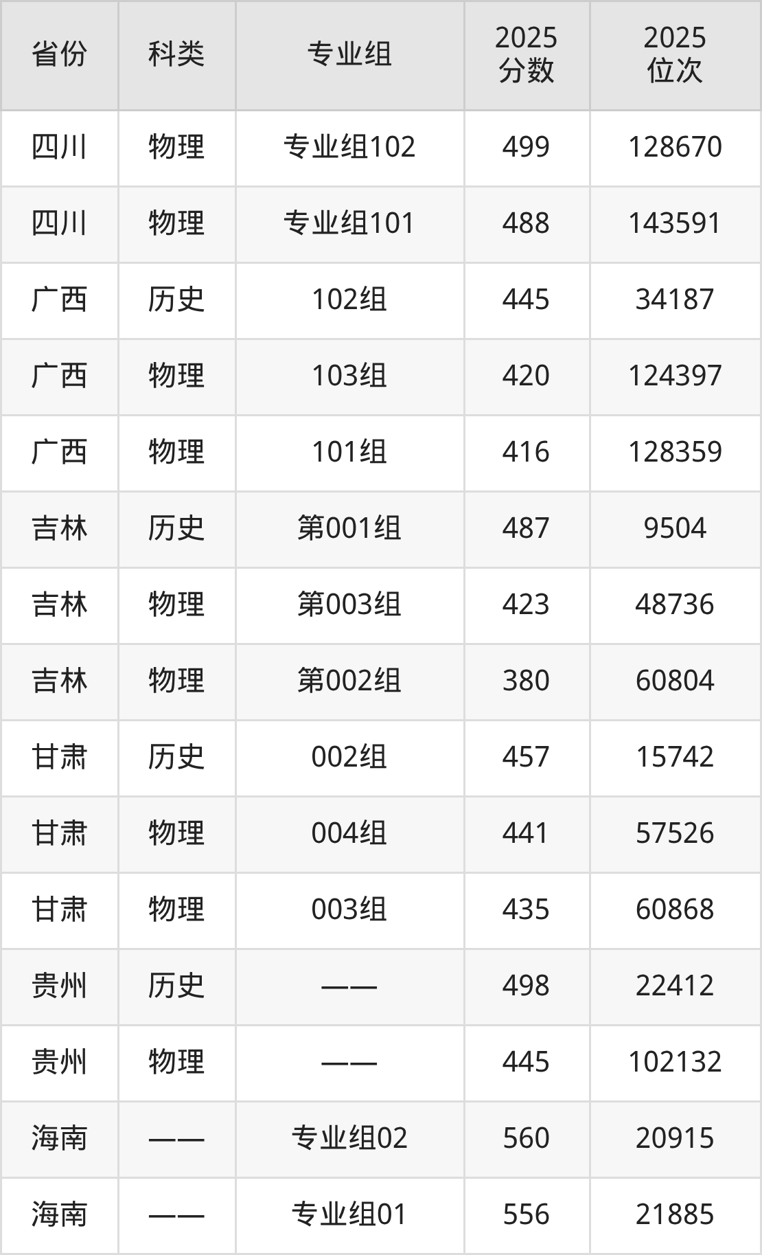 1、吉林:最低分380分,对应最低分专业组为物理类第002组,位次60804名;