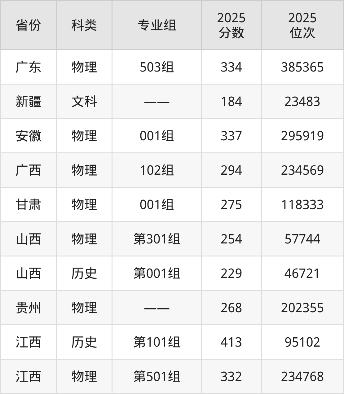 4、甘肃:最低分275分,对应最低分专业组为物理类001组,位次118333名;