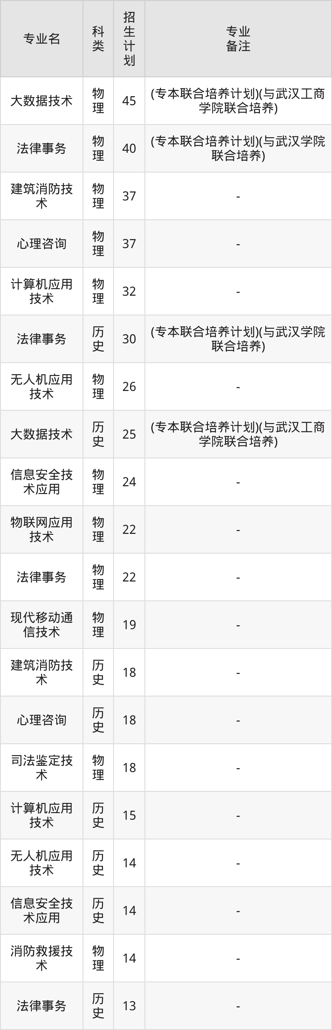 值得注意的是,武汉警官职业学院在专科批招生,招生类型为物理类、历史类。篇幅有限,这里仅附上武汉警官职业学院在湖北省内招生计划详情: