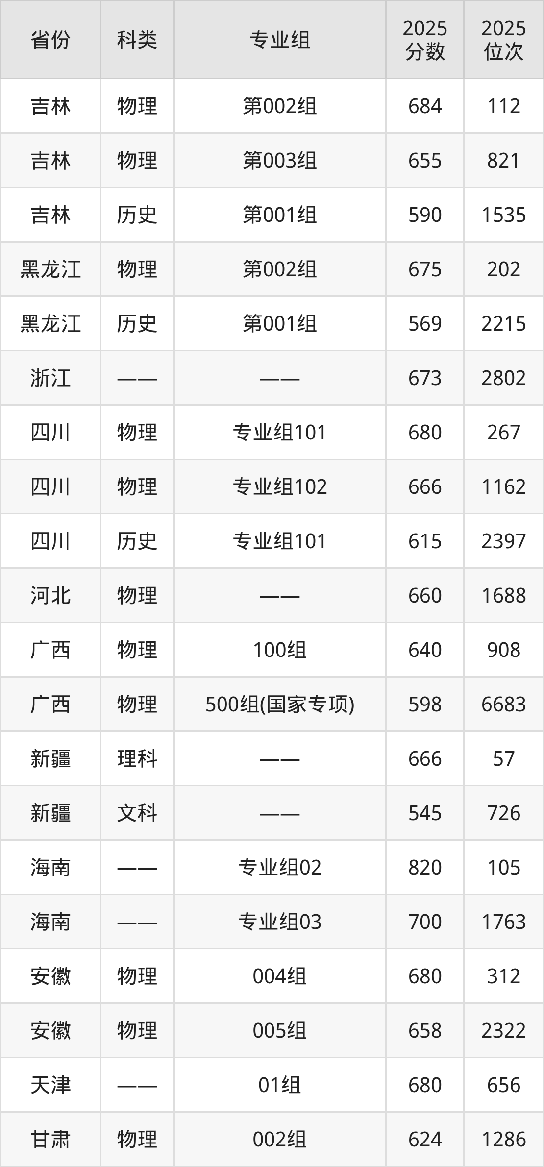 2025复旦大学上海医学院在各省录取最低分在545分到820分之间不等,其中分数门槛最低的是新疆,最高的是海南。下面展示复旦大学上海医学院录取分数线最低的5个省份(含最低分专业组及位次):