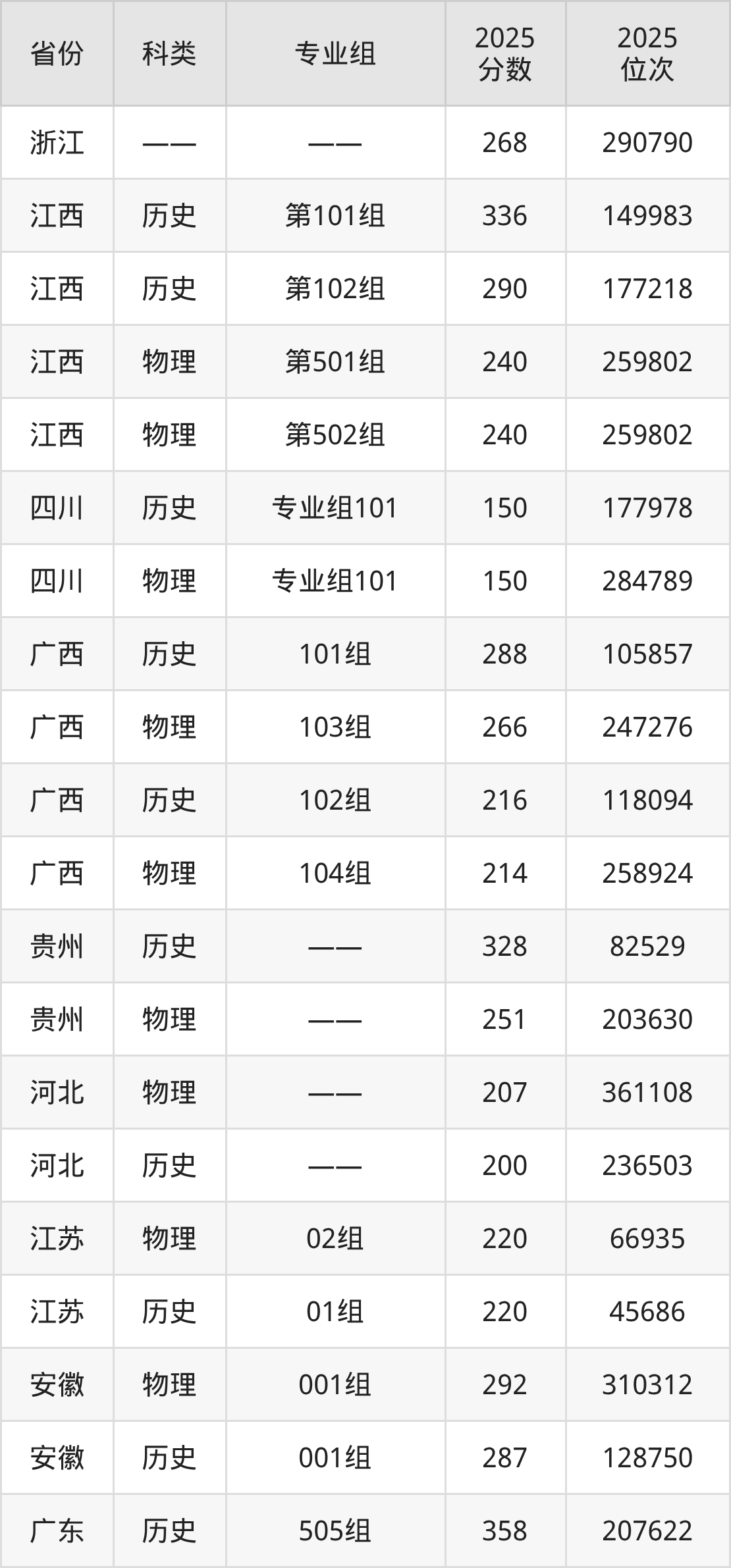 1、四川:最低分150分,对应最低分专业组为物理类专业组101,位次284789名;