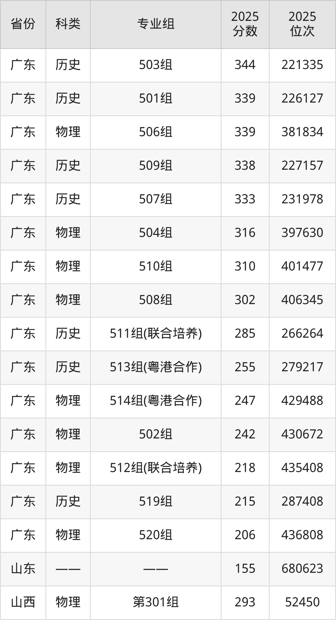 4、广东:最低分206分,对应最低分专业组为物理类520组,位次436808名;