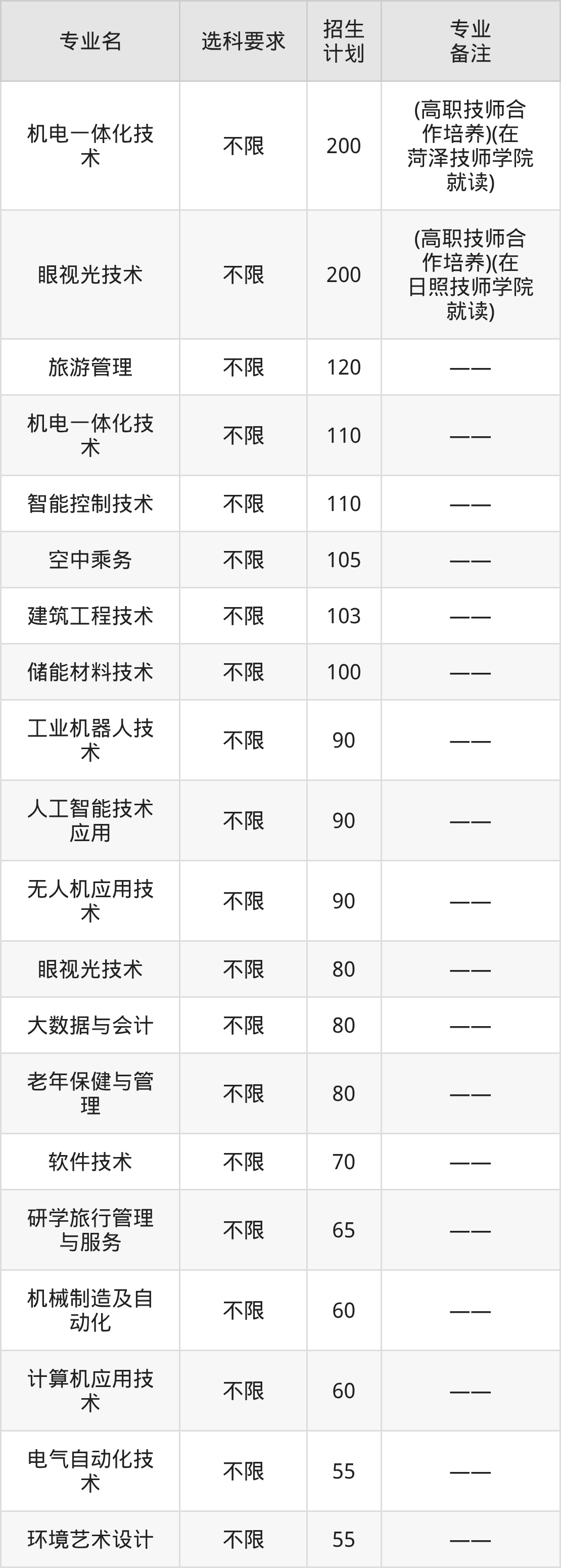 第一名:山东(3473人),招生人数最多的专业是机电一体化技术(200人、普通类,(高职技师合作培养)(在菏泽技师学院就读))。