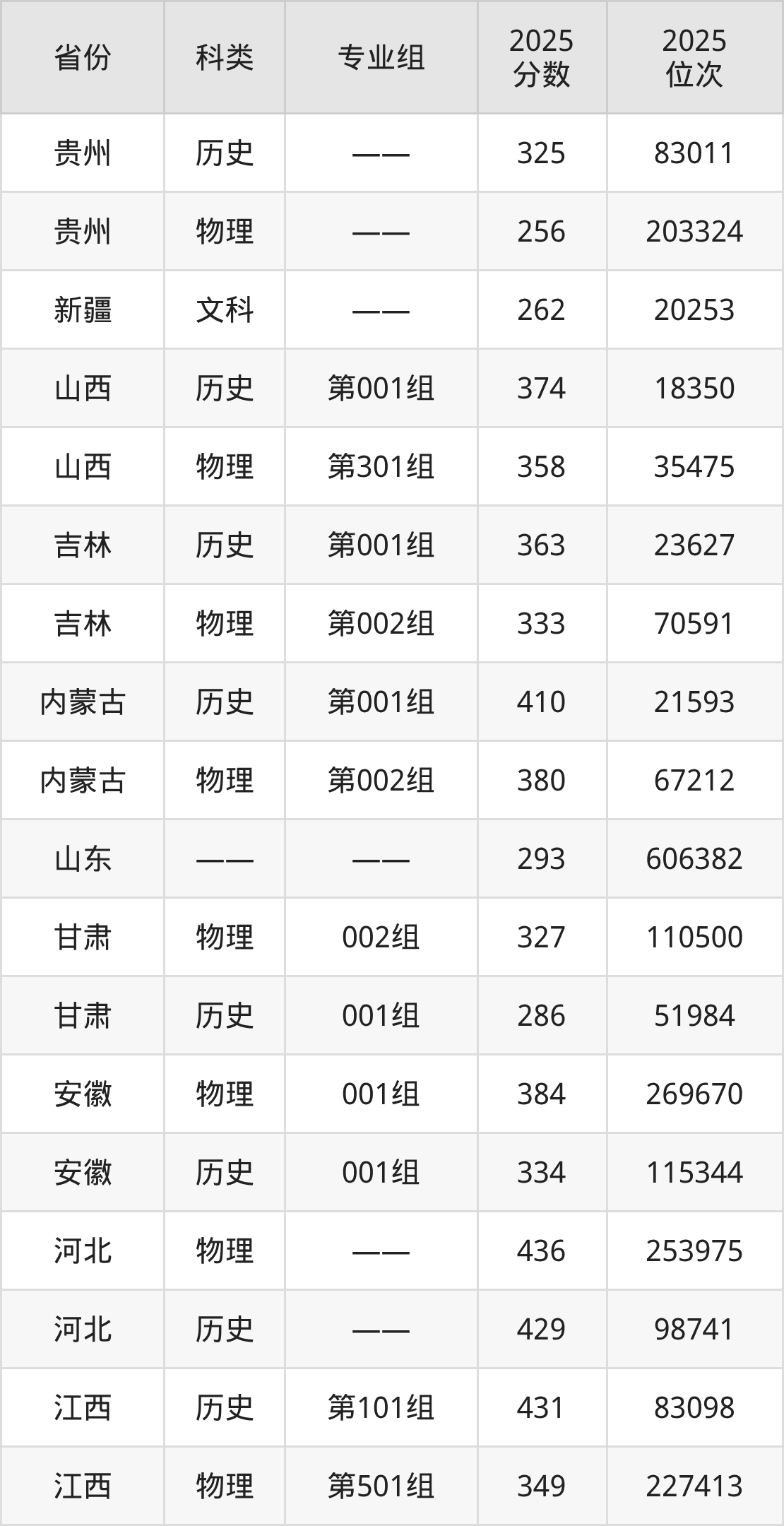 2025济宁职业技术学院在各省录取最低分在256分到436分之间不等,其中分数门槛最低的是贵州,最高的是河北。下面展示济宁职业技术学院录取分数线最低的5个省份(含最低分专业组及位次):