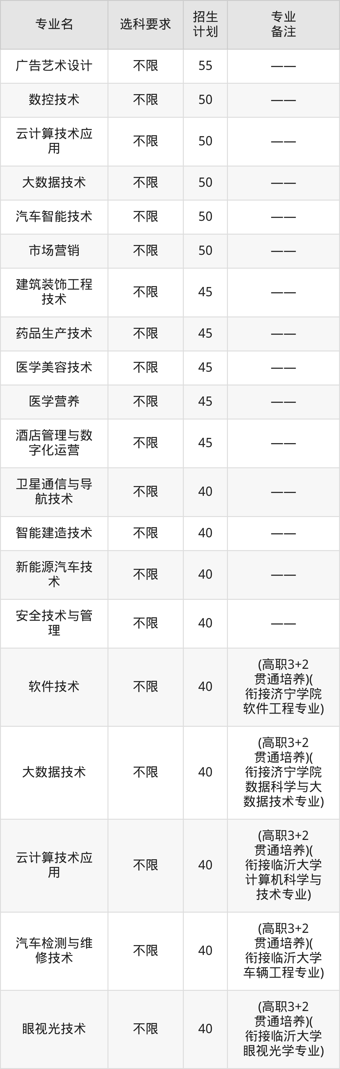 值得注意的是,济宁职业技术学院在专科批招生,招生类型为普通类。篇幅有限,这里仅附上济宁职业技术学院在山东省内招生计划详情:
