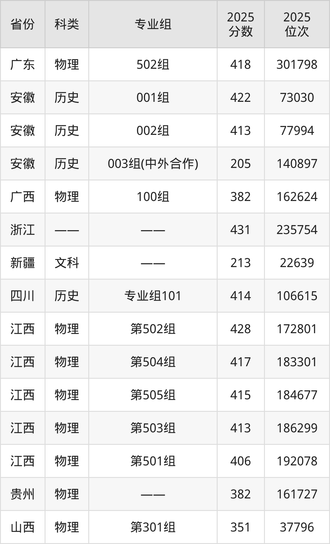 1、安徽:最低分205分,对应最低分专业组为历史类003组(中外合作),位次140897名;