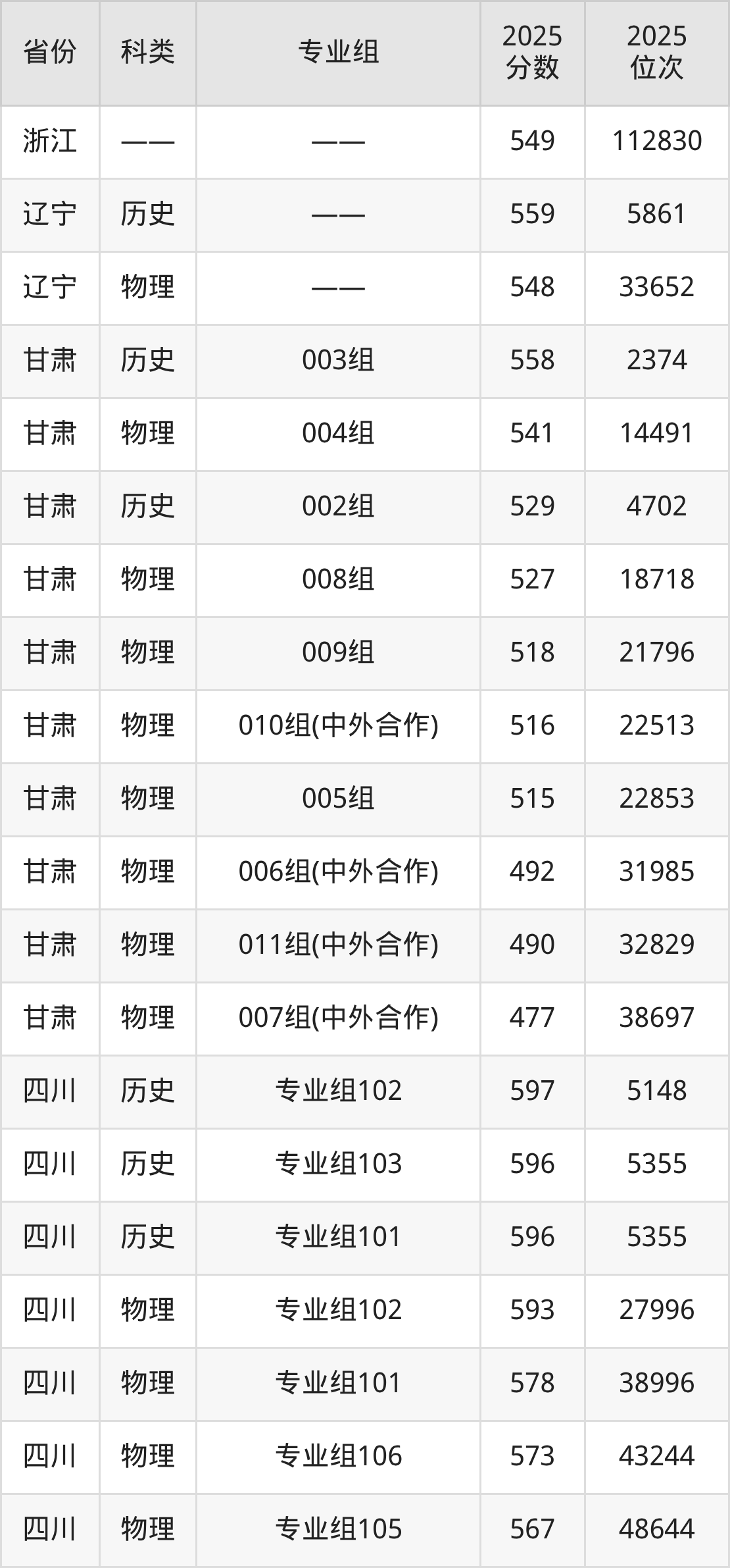 4、甘肃:最低分477分,对应最低分专业组为物理类007组(中外合作),位次38697名;