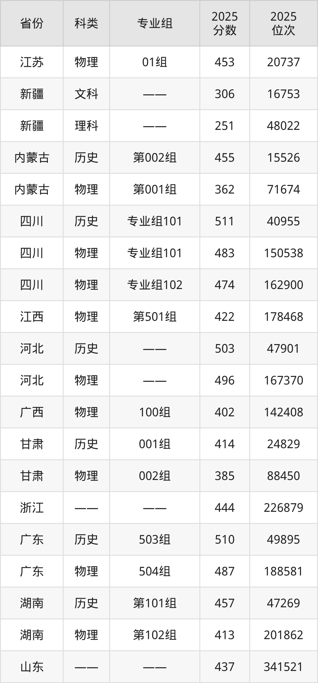 2025四川交通职业技术学院在各省录取最低分在251分到511分之间不等,其中分数门槛最低的是新疆,最高的是河北。下面展示四川交通职业技术学院录取分数线最低的5个省份(含最低分专业组及位次):