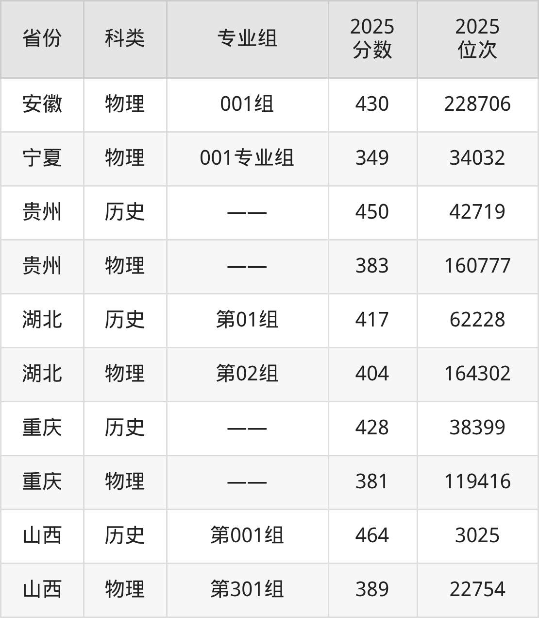 2、宁夏:最低分349分,对应最低分专业组为物理类001专业组,位次34032名;