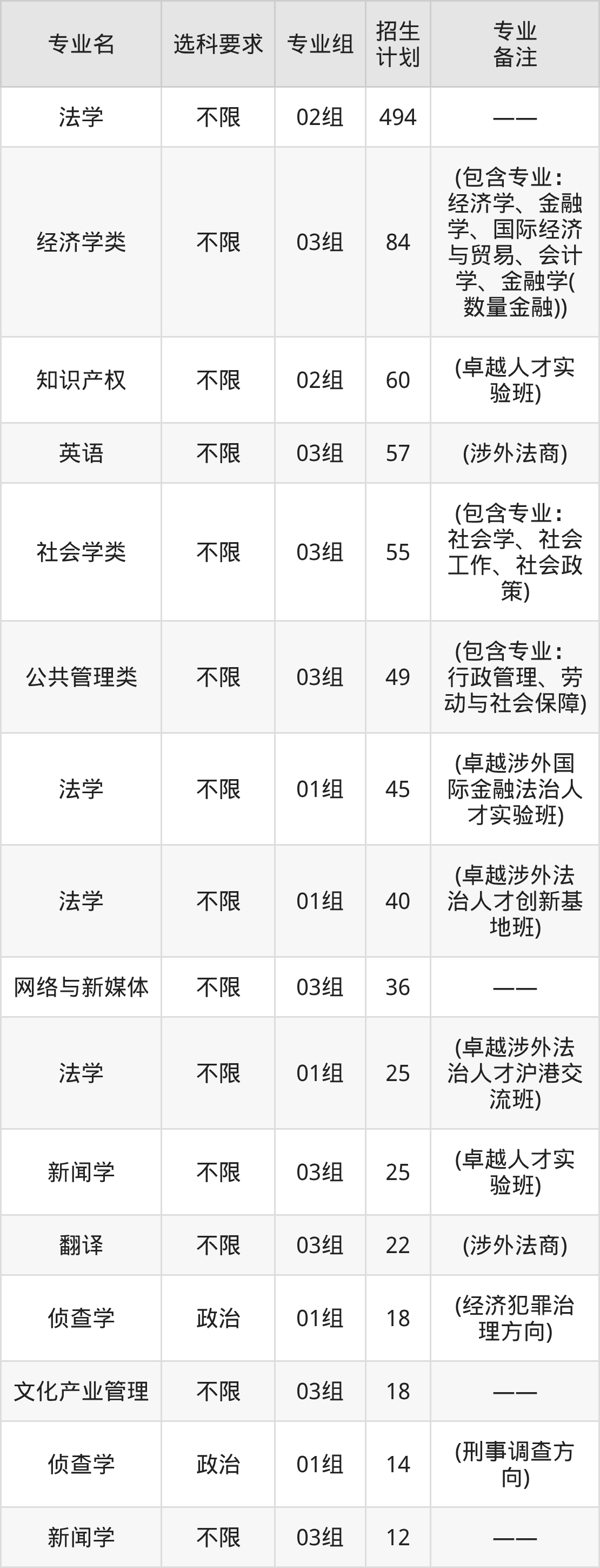 值得注意的是,华东政法大学在本科批、本科提前批招生,招生类型为普通类。篇幅有限,这里仅附上华东政法大学在上海市内招生计划详情: