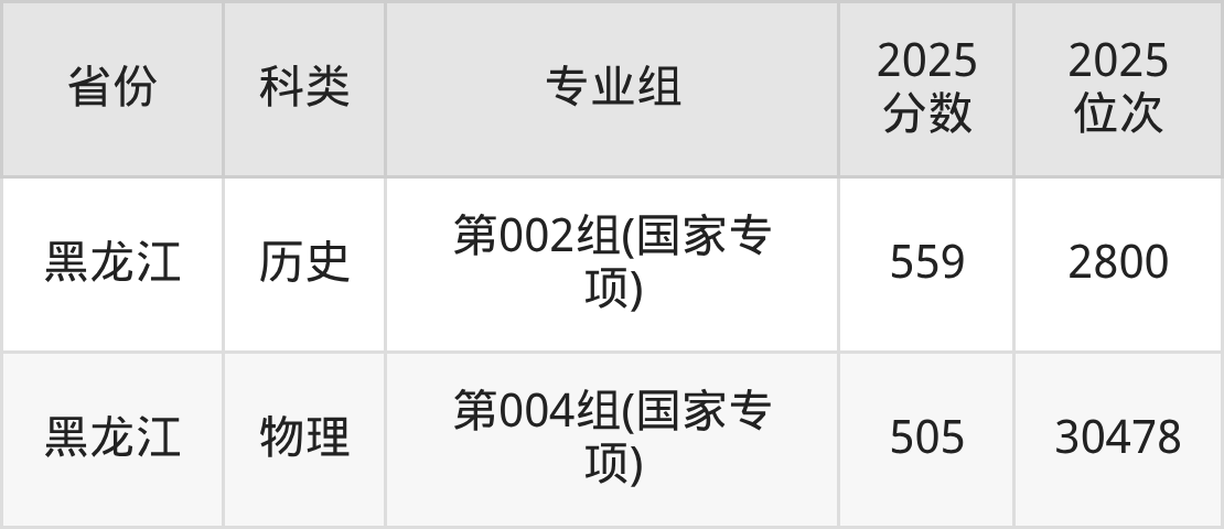 2、黑龙江:最低分505分,对应最低分专业组为物理类第004组(国家专项),位次30478名;