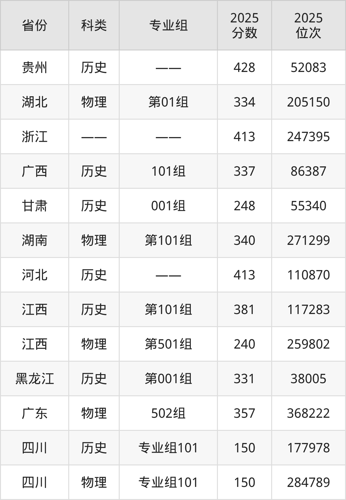 1、四川:最低分150分,对应最低分专业组为物理类专业组101,位次284789名;