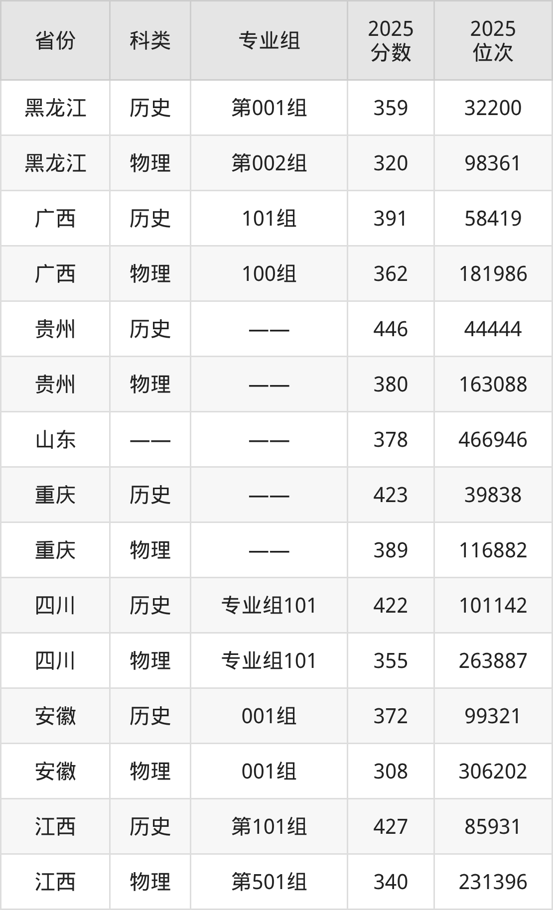 3、江西:最低分340分,对应最低分专业组为物理类第501组,位次231396名;