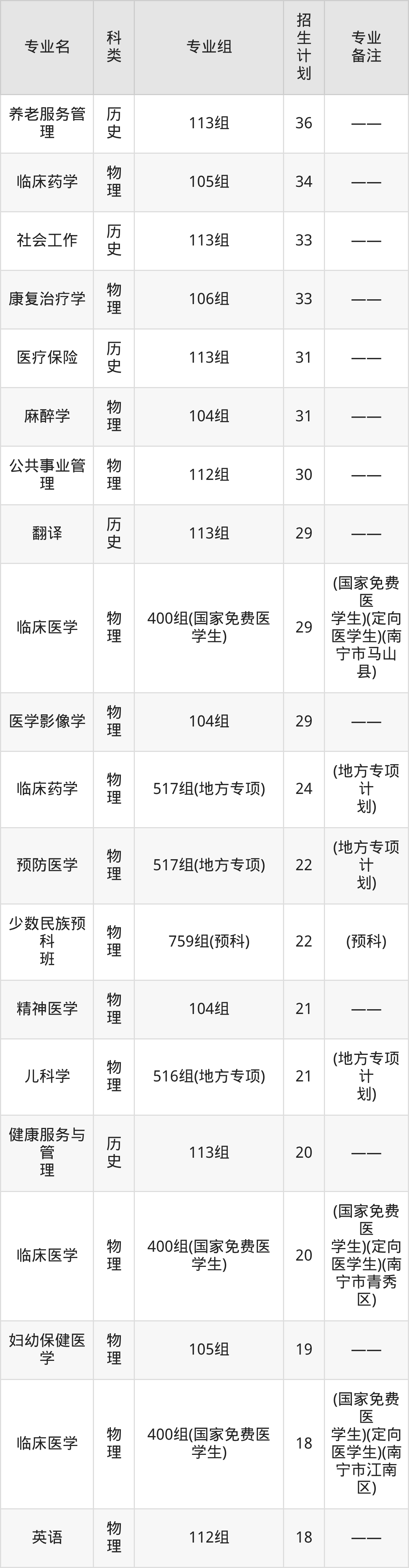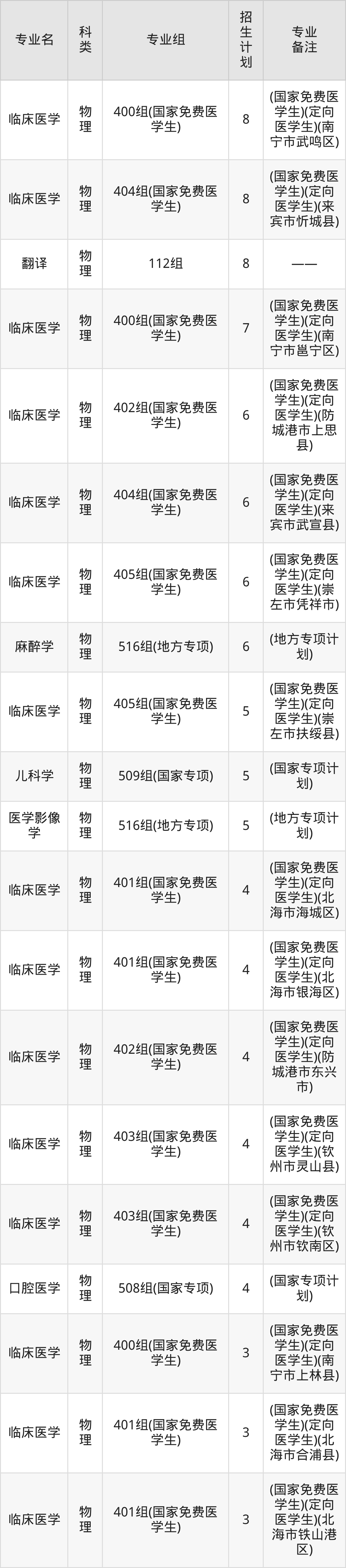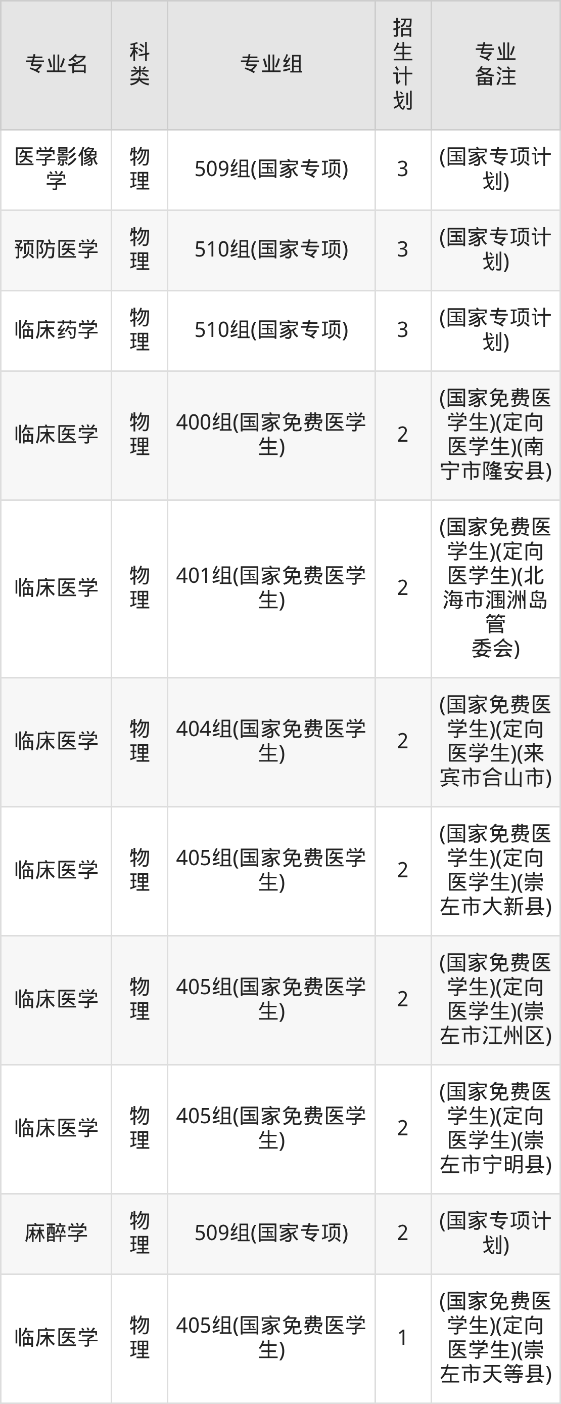 值得注意的是,广西医科大学在本科批、专科批、本科提前批招生,招生类型为物理类、历史类。篇幅有限,这里仅附上广西医科大学在广西壮族自治区内招生计划详情: