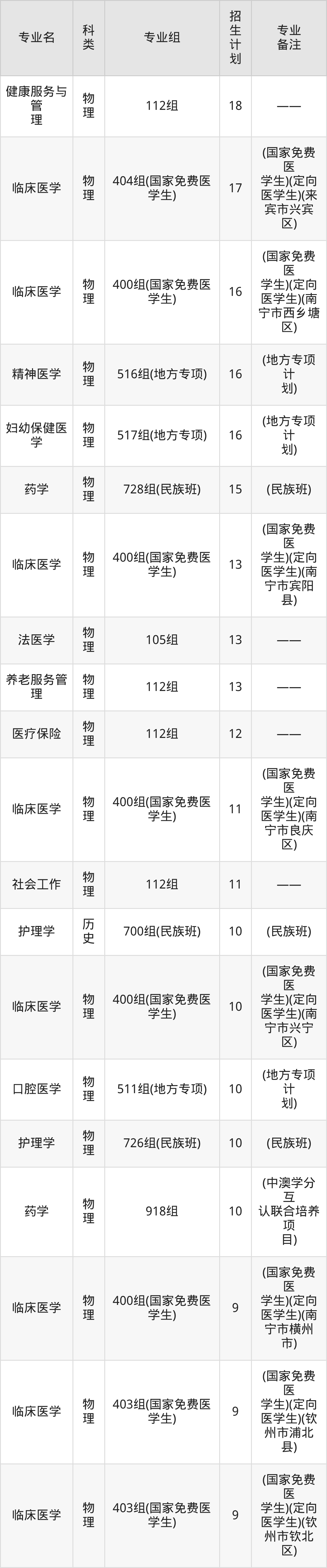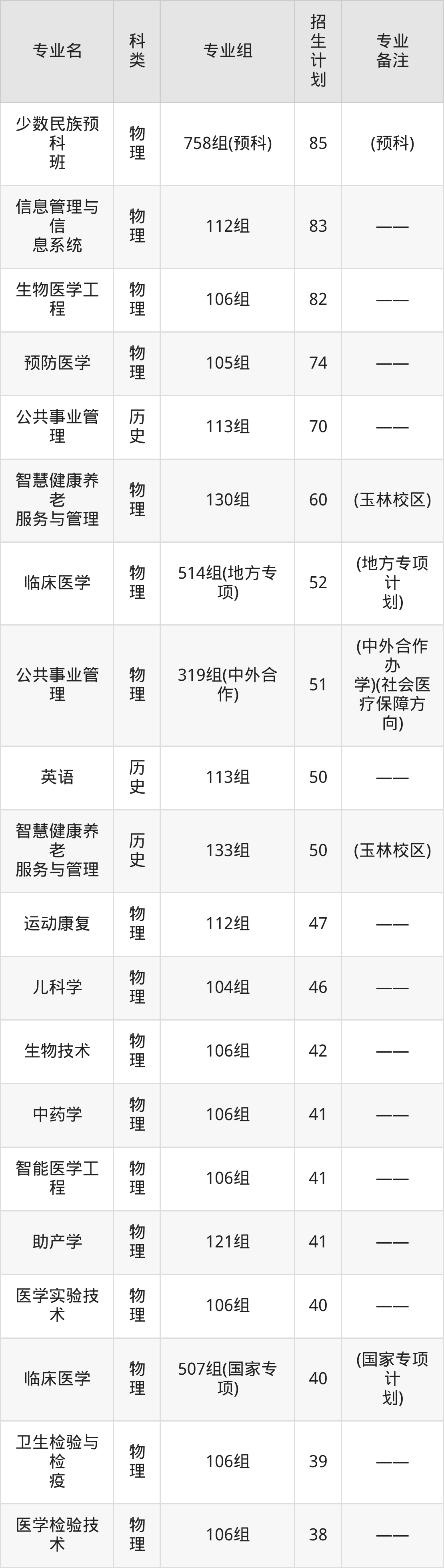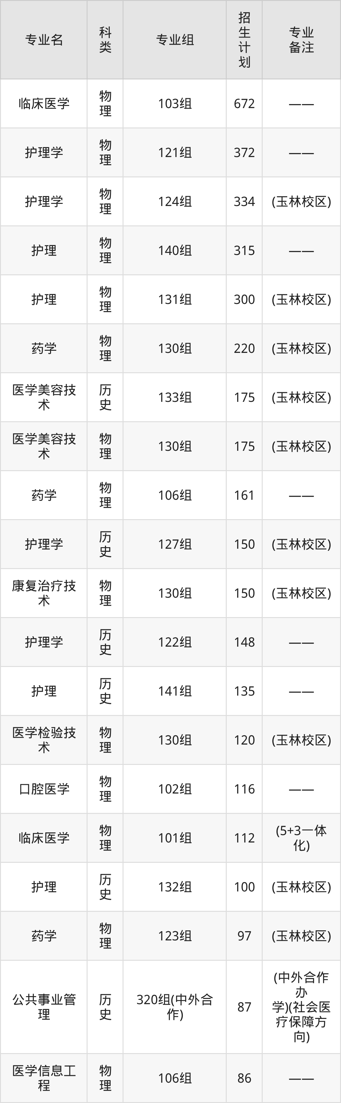 值得注意的是,广西医科大学在本科批、专科批、本科提前批招生,招生类型为物理类、历史类。篇幅有限,这里仅附上广西医科大学在广西壮族自治区内招生计划详情: