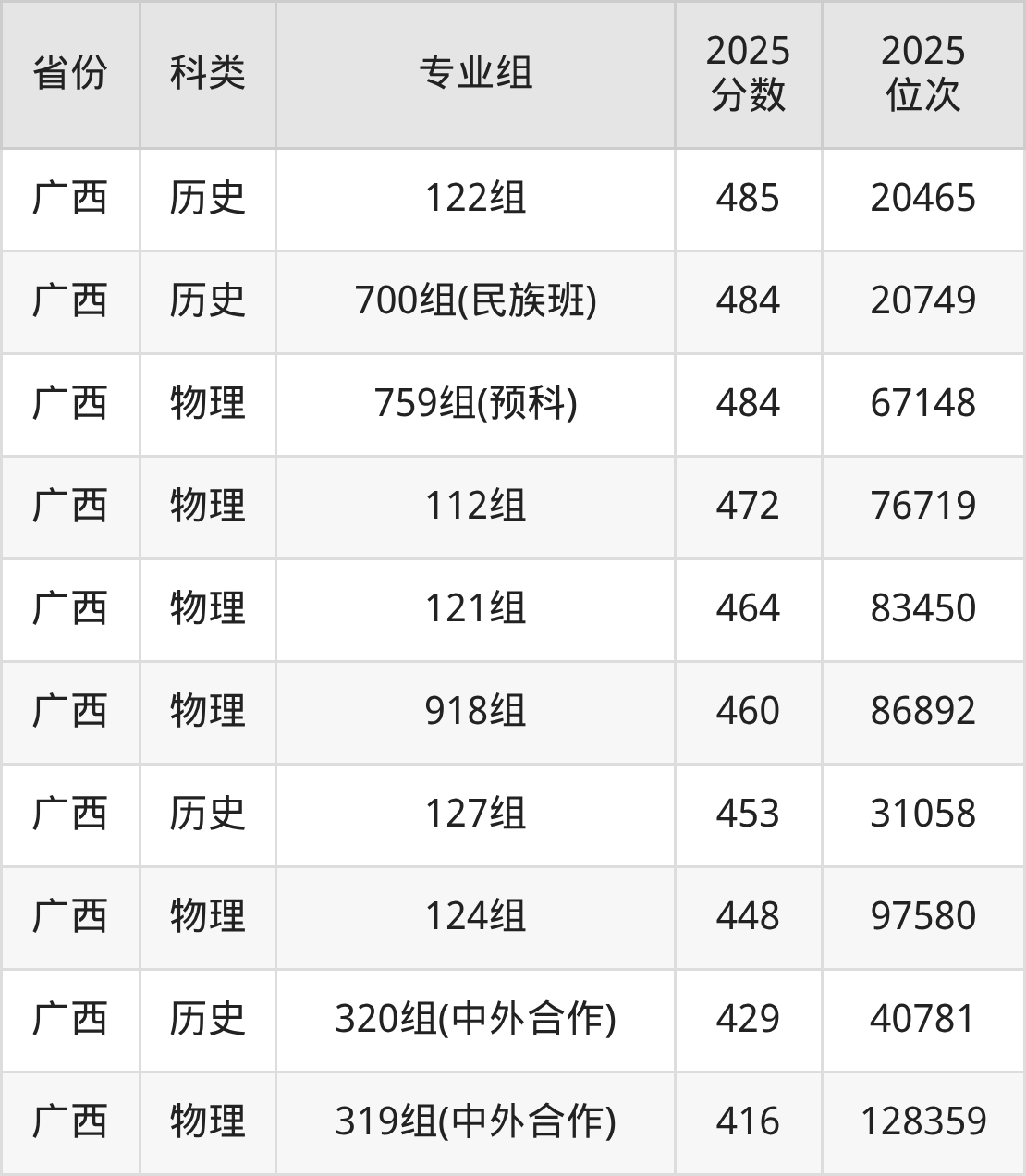1、广西:最低分416分,对应最低分专业组为物理类319组(中外合作),位次128359名;