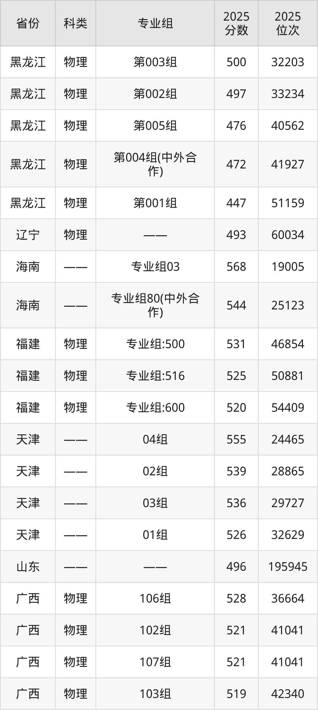 2、黑龙江:最低分447分,对应最低分专业组为物理类第001组,位次51159名;