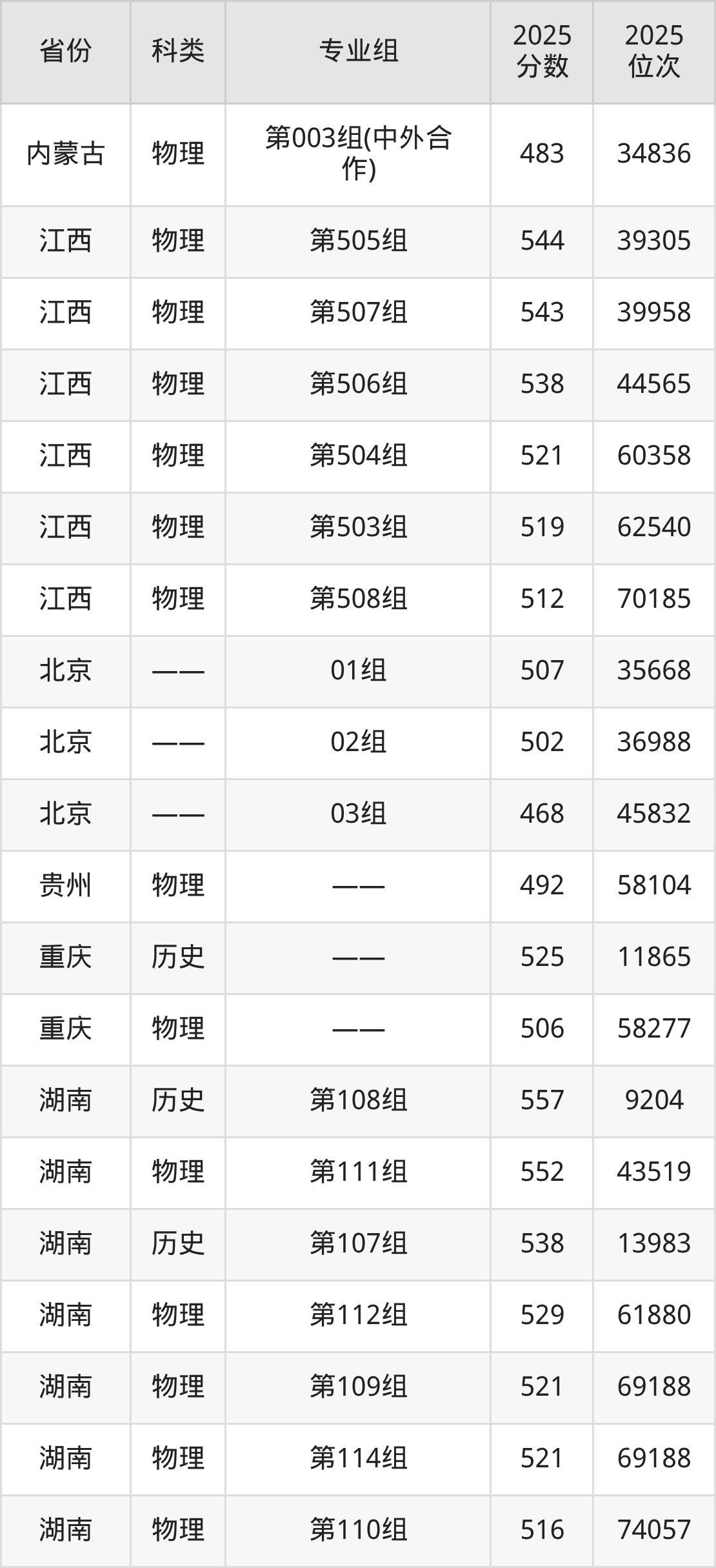 5、北京:最低分468分,对应最低分专业组为03组,位次45832名;