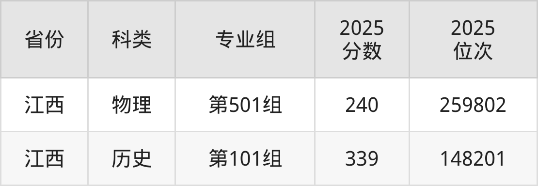 2025年九江理工职业学院在江西省录取最低分为240分,对应最低分专业组为第501组,位次在259802名及以内的物理类考生有机会被录取。而结合批次线来看,考生至少要超专科线-50分才达院校收分门槛。
