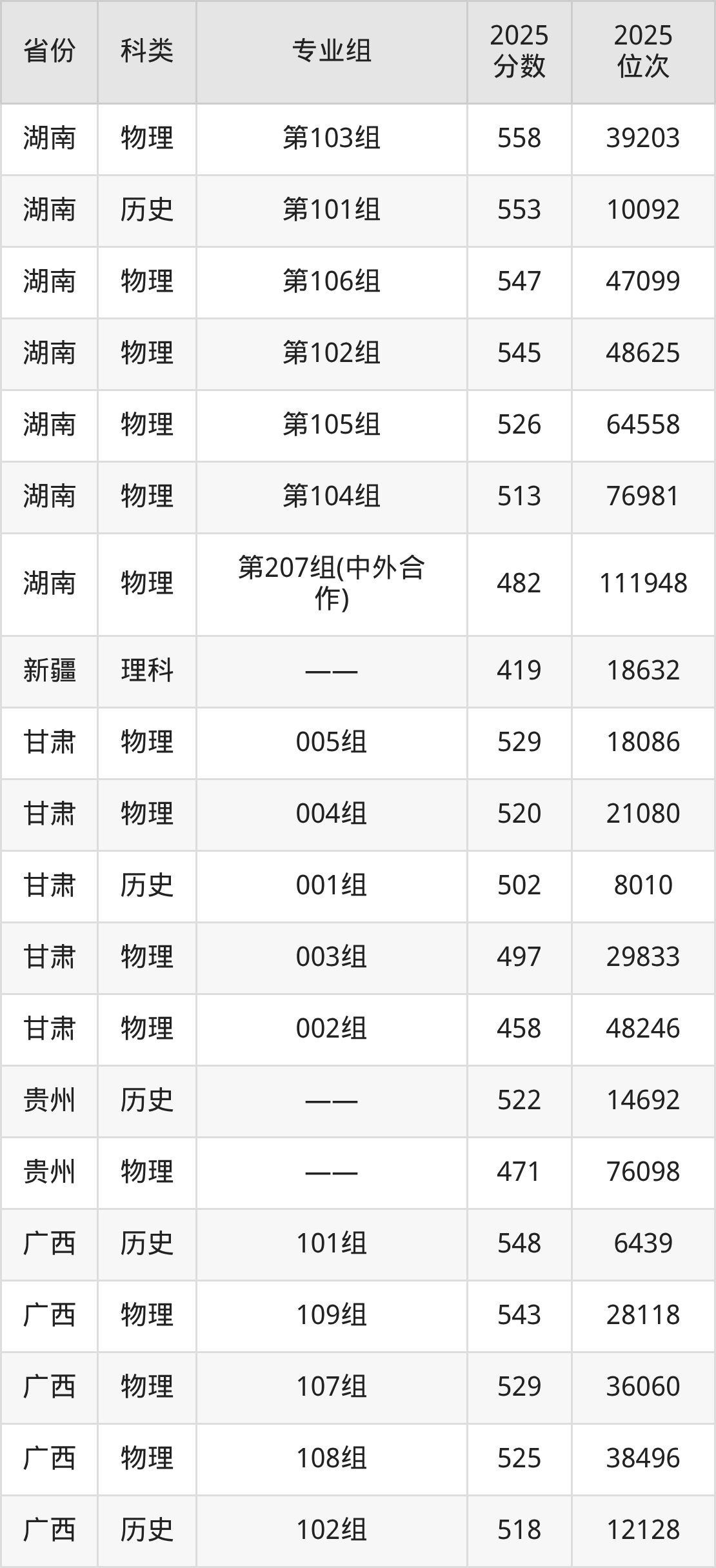 5、湖南:最低分482分,对应最低分专业组为物理类第207组(中外合作),位次111948名;