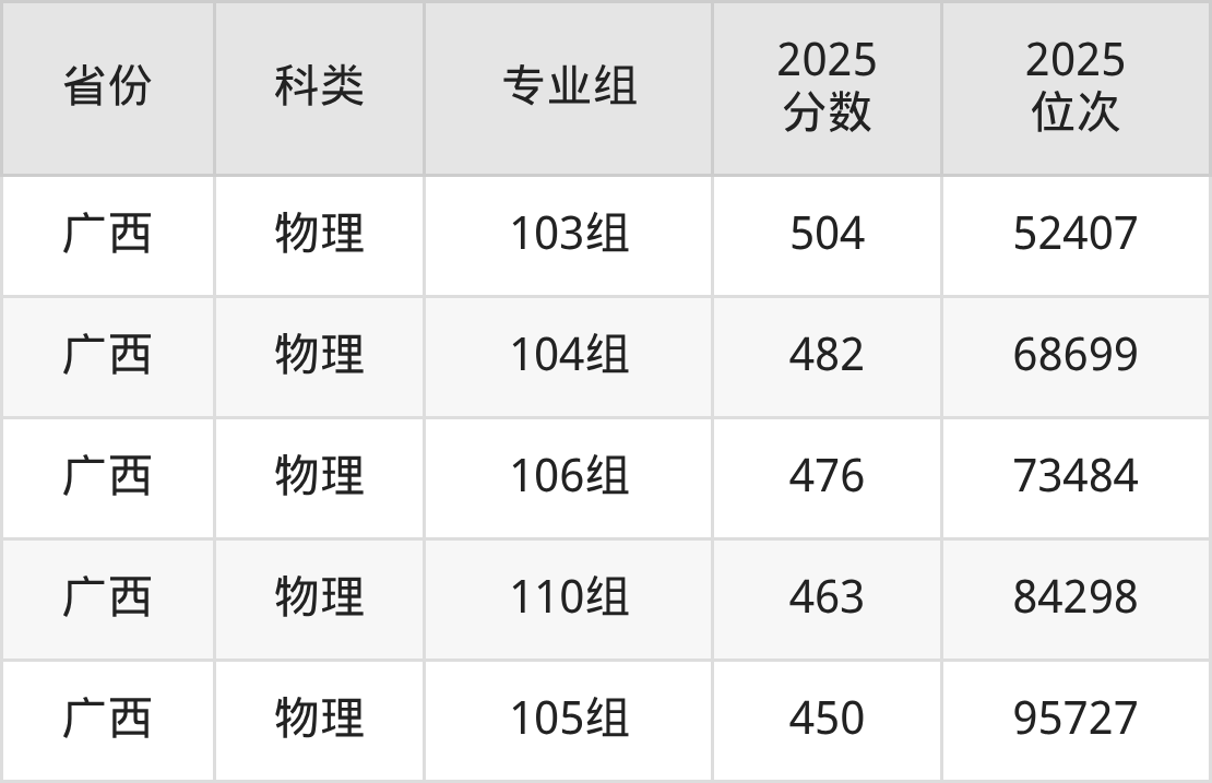 2、广西:最低分450分,对应最低分专业组为物理类105组,位次95727名;