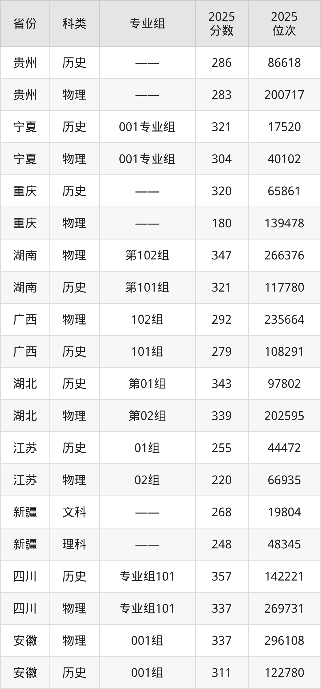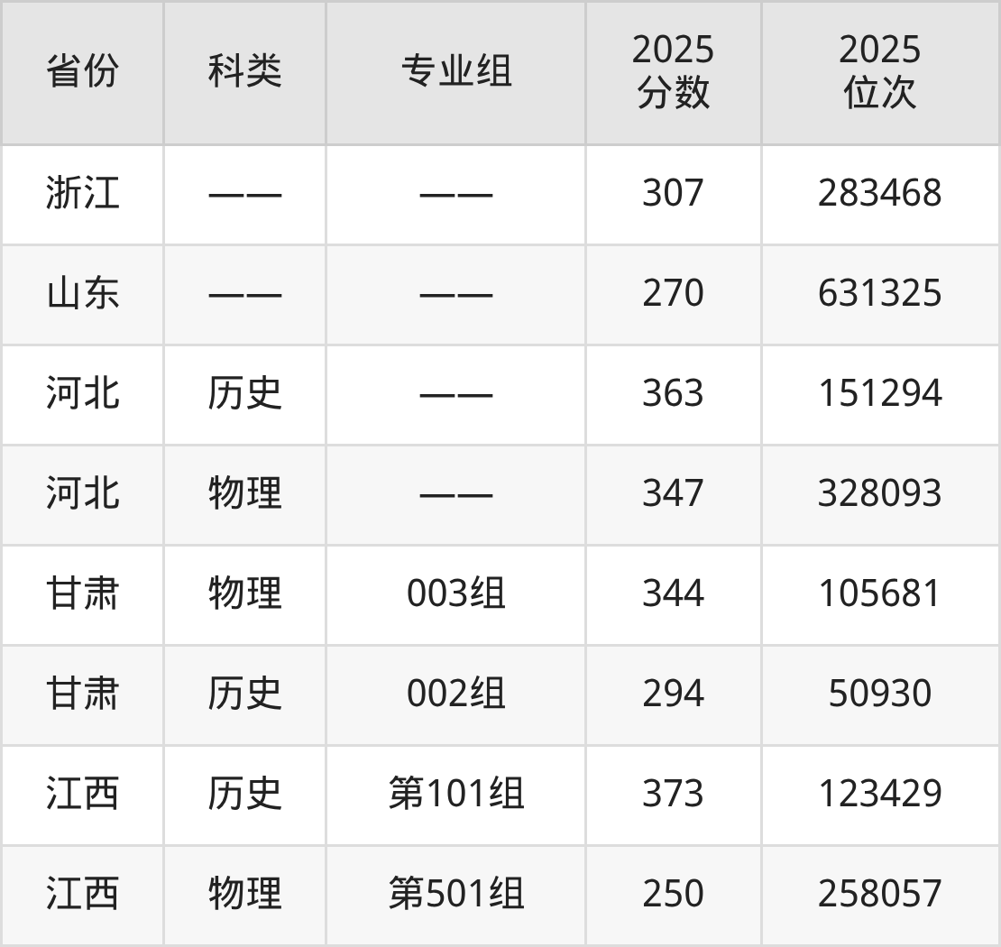4、江西:最低分250分,对应最低分专业组为物理类第501组,位次258057名;