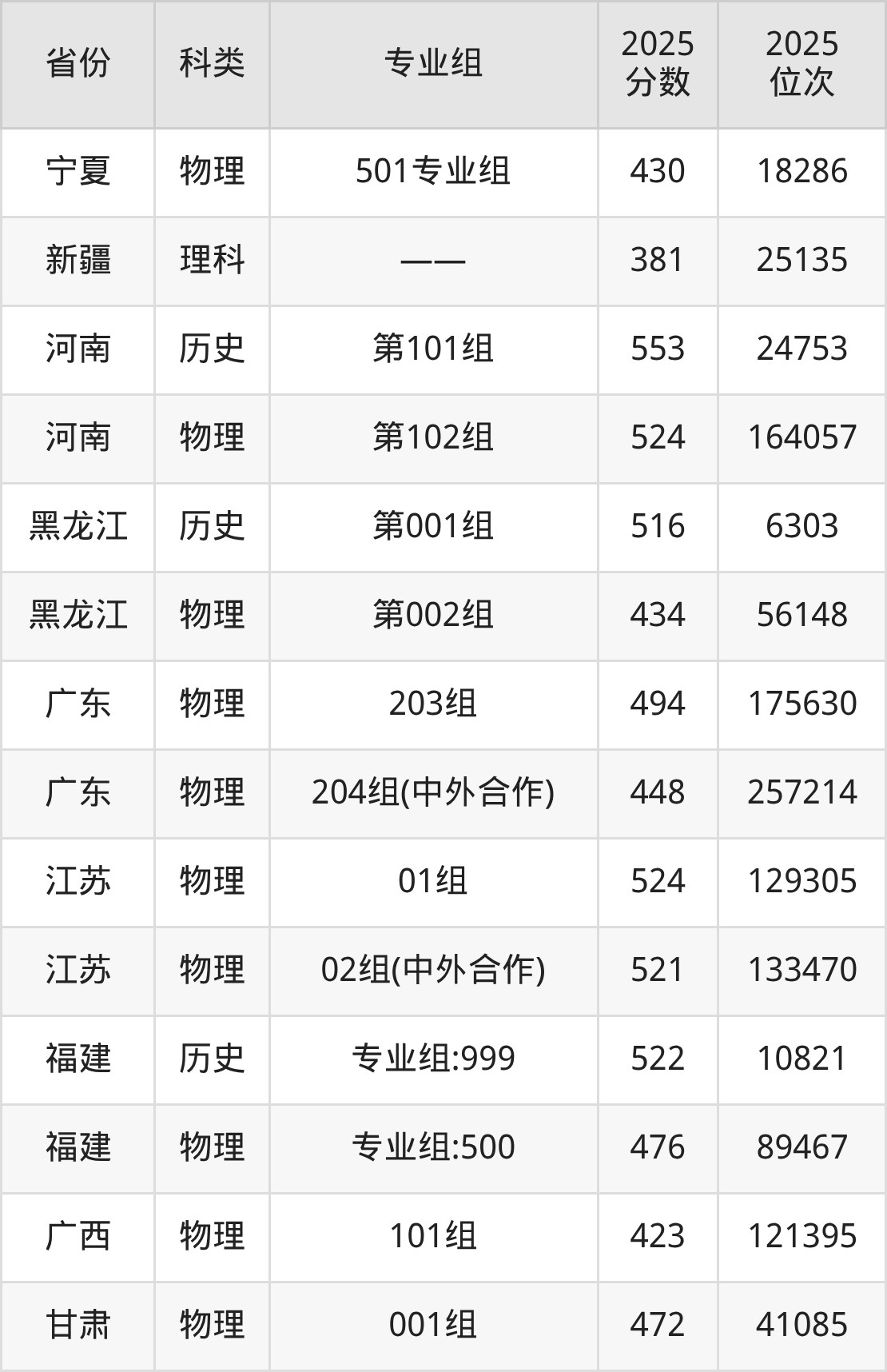 4、宁夏:最低分430分,对应最低分专业组为物理类501专业组,位次18286名;