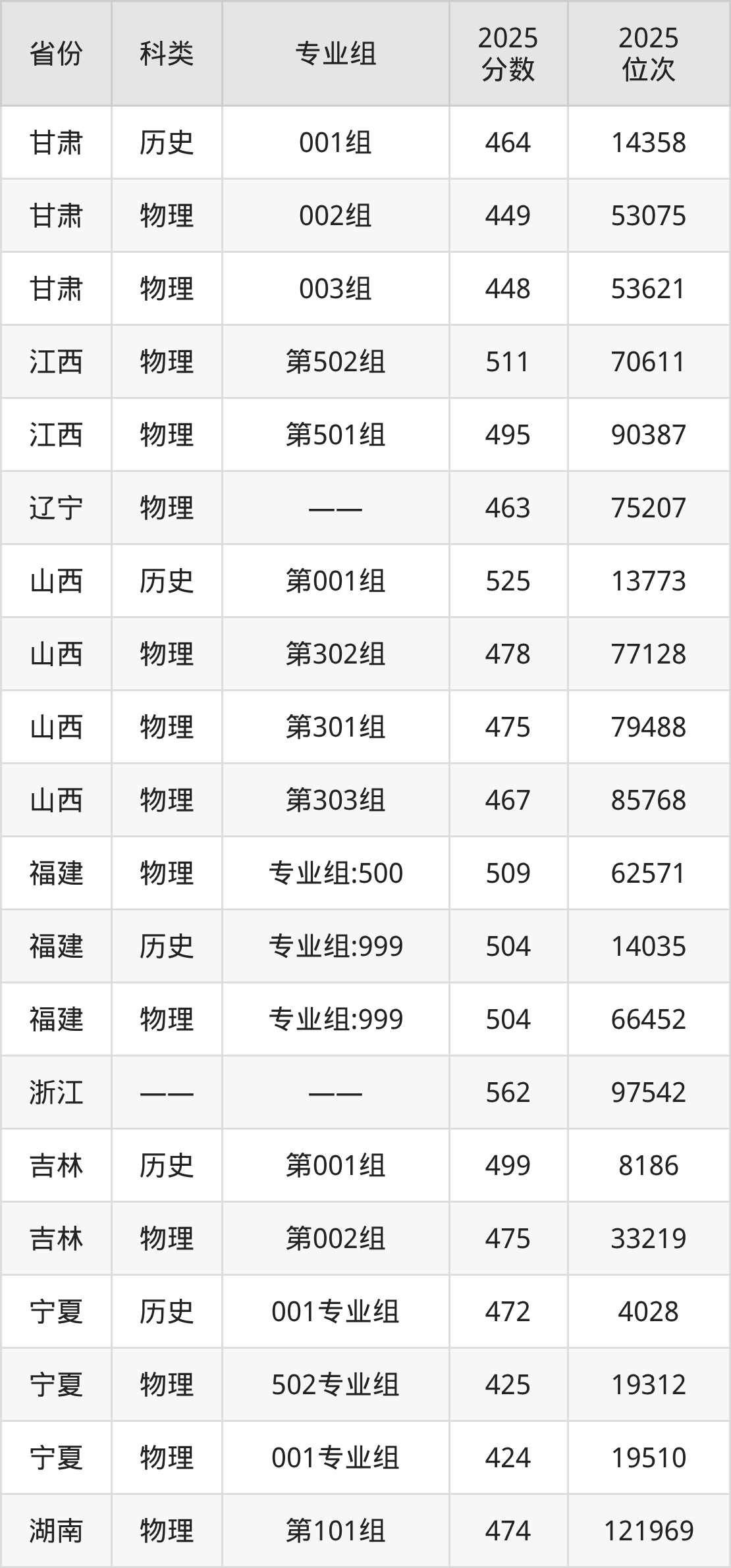 5、甘肃:最低分448分,对应最低分专业组为物理类003组,位次53621名;