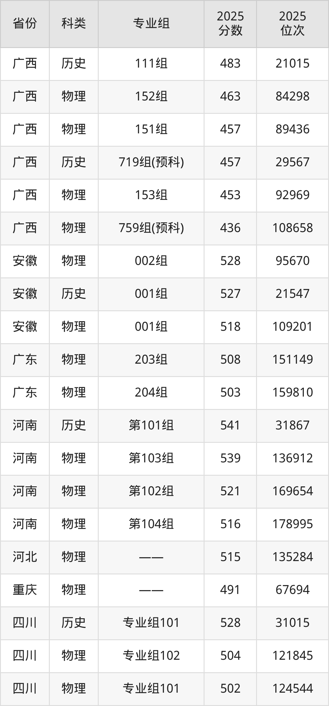 3、广西:最低分436分,对应最低分专业组为物理类759组(预科),位次108658名;