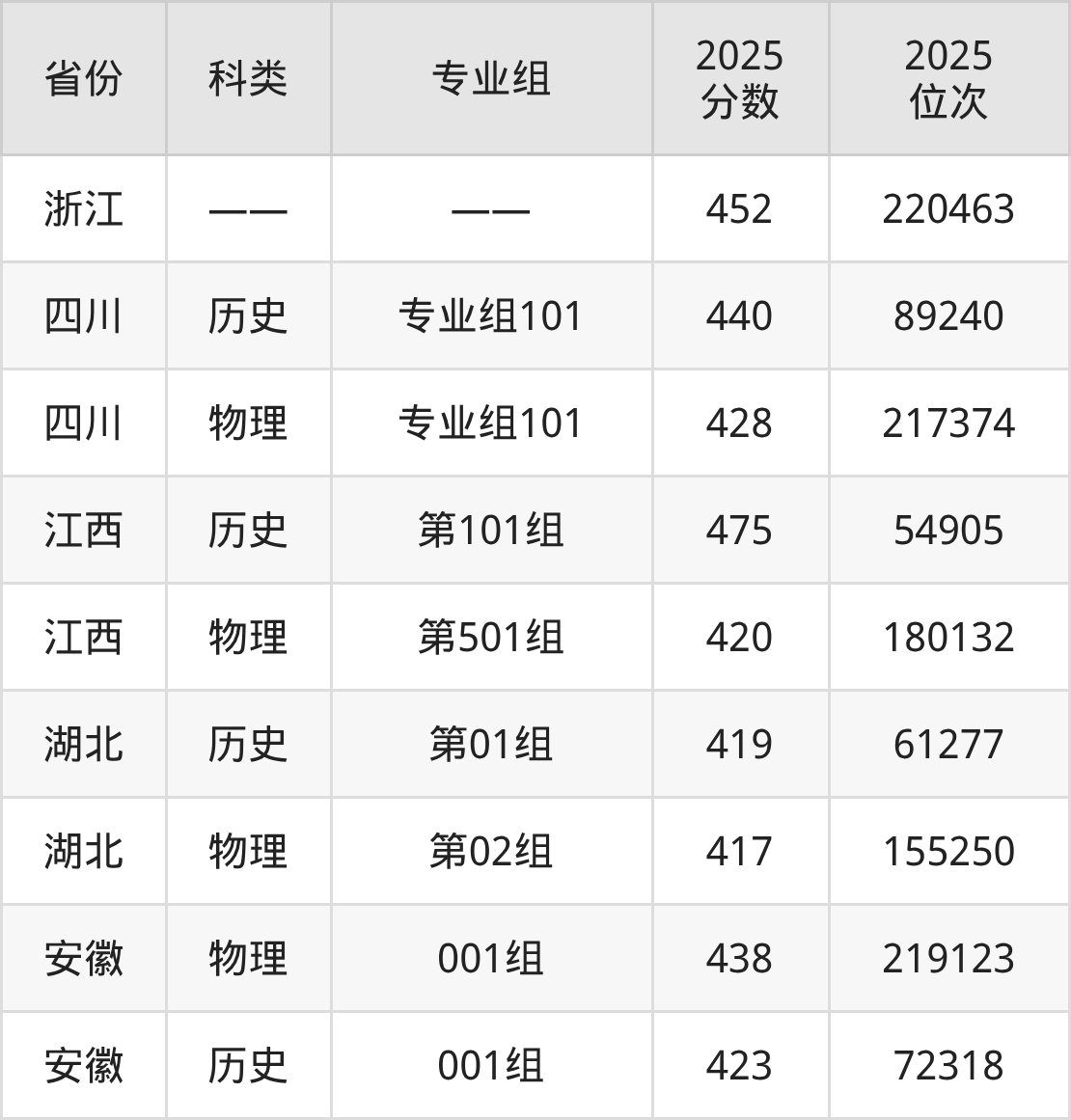 2025义乌工商职业技术学院在各省录取最低分在417分到475分之间不等,其中分数门槛最低的是湖北,最高的是浙江。下面展示义乌工商职业技术学院录取分数线最低的5个省份(含最低分专业组及位次):