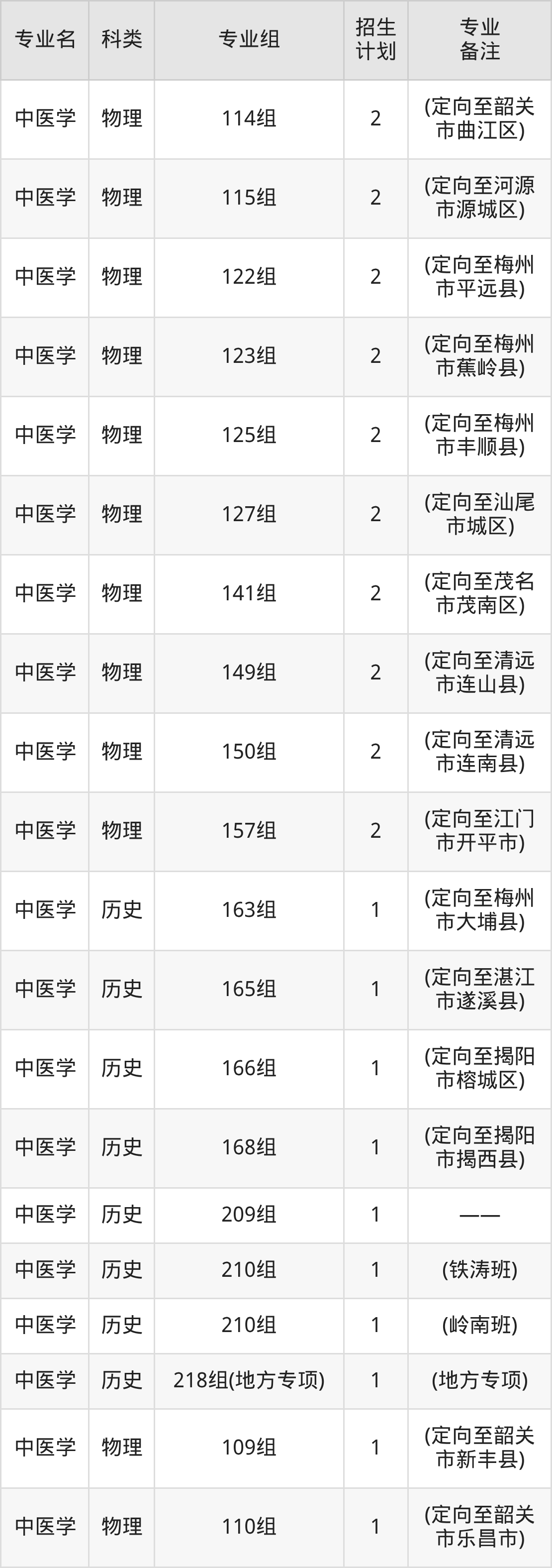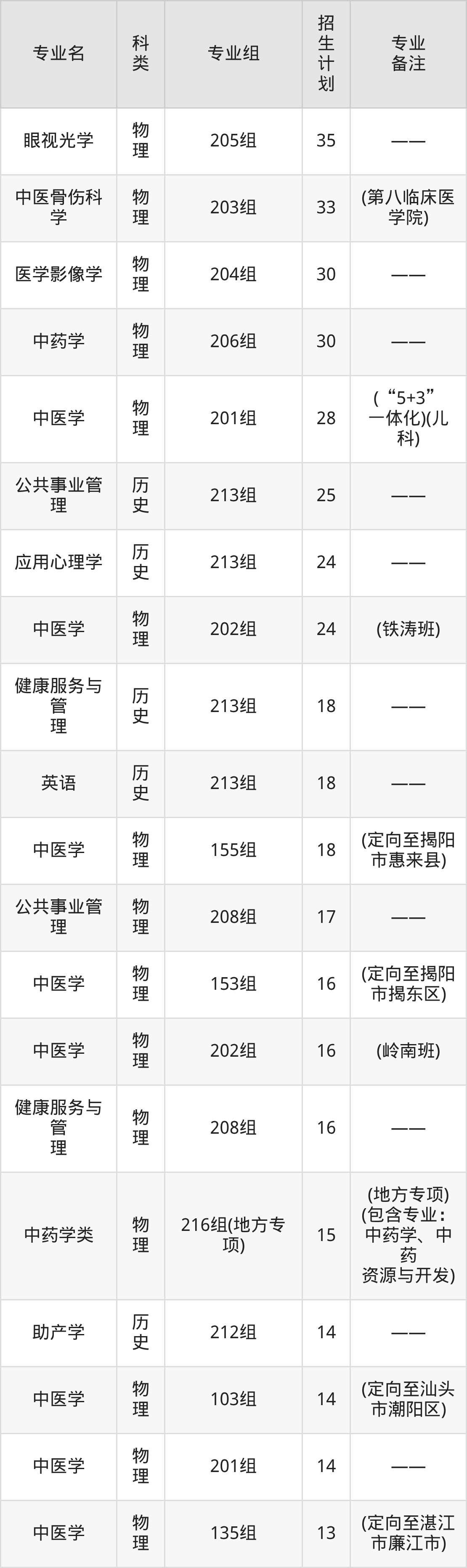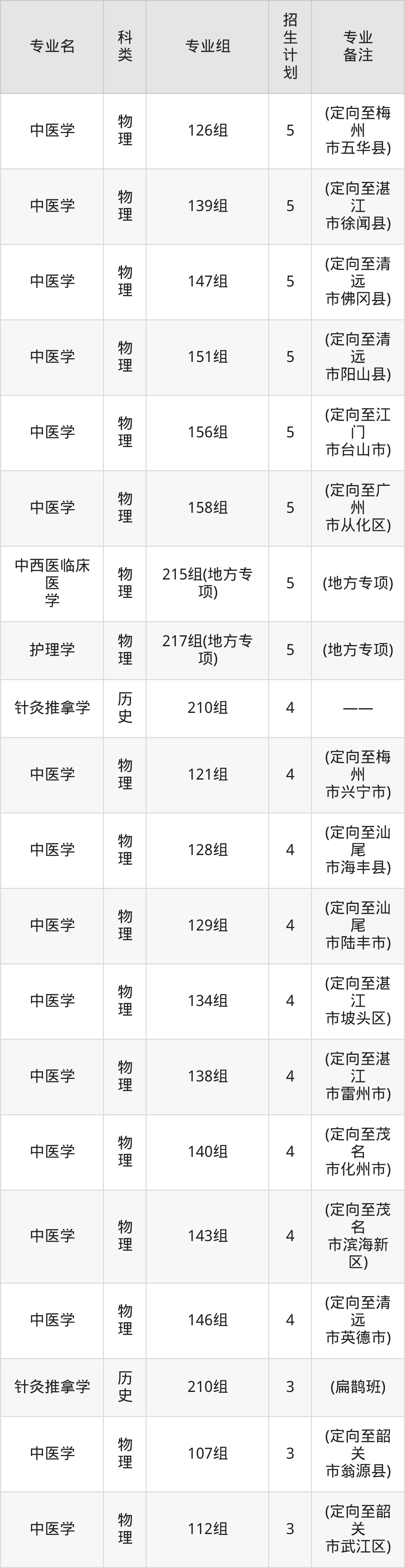 值得注意的是,广州中医药大学在本科批、本科提前批招生,招生类型为物理类、历史类。篇幅有限,这里仅附上广州中医药大学在广东省内招生计划详情: