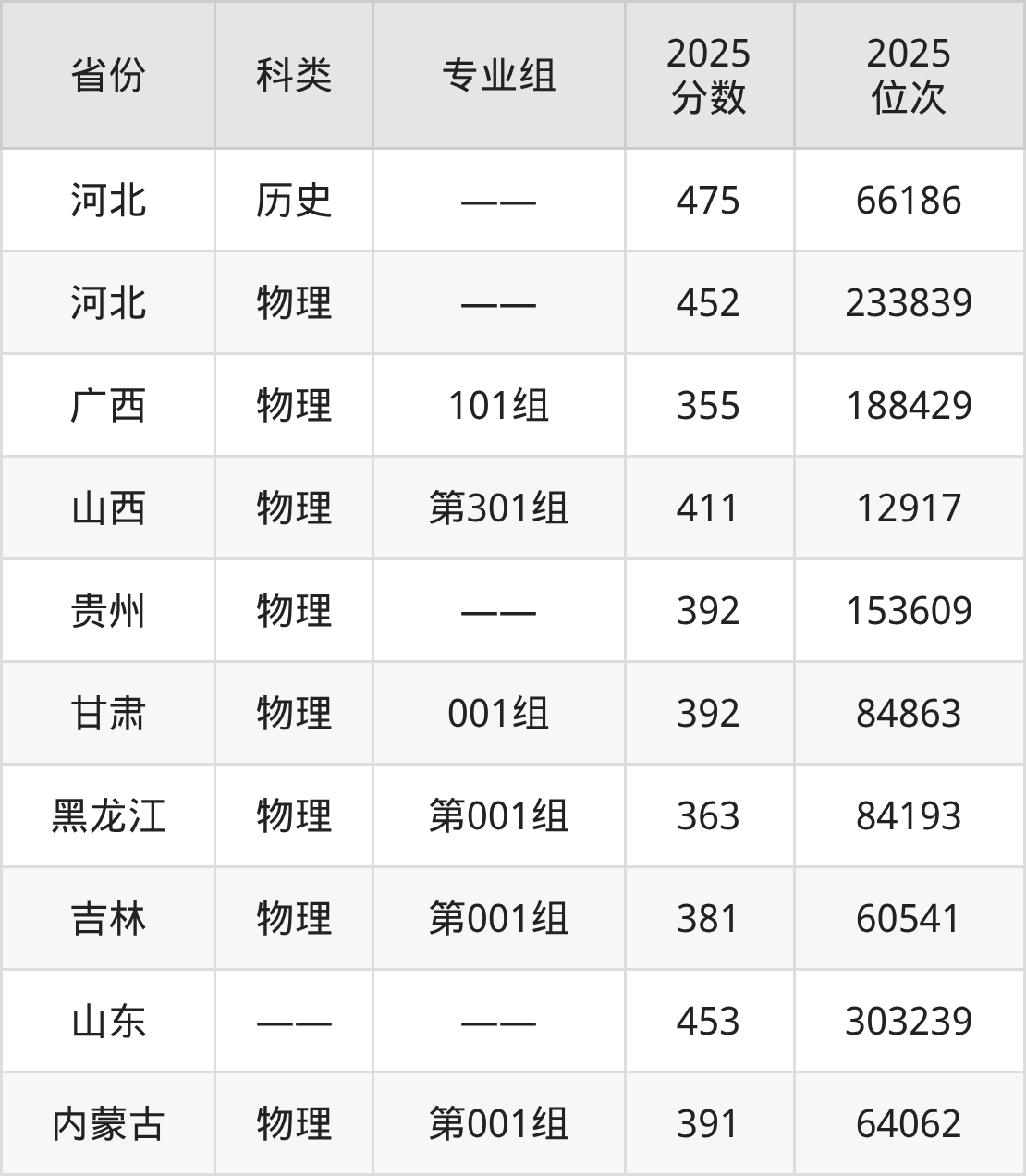 5、甘肃:最低分392分,对应最低分专业组为物理类001组,位次84863名;