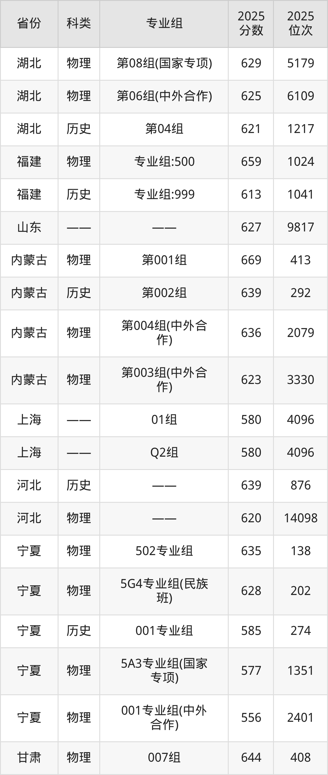 1、宁夏:最低分556分,对应最低分专业组为物理类001专业组(中外合作),位次2401名;