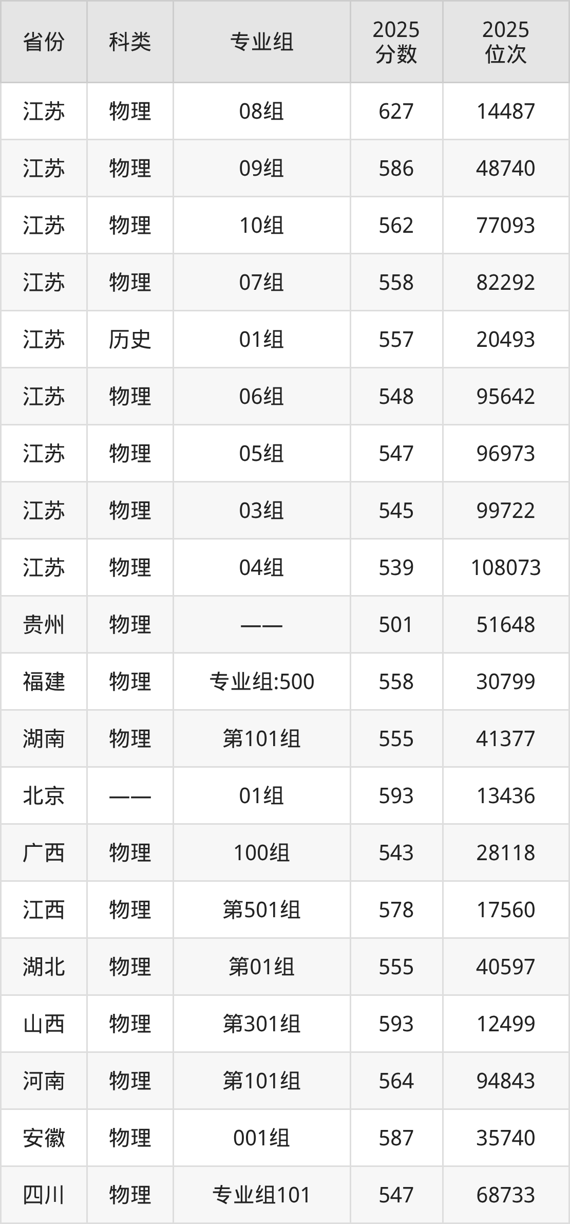 4、江苏:最低分539分,对应最低分专业组为物理类04组,位次108073名;