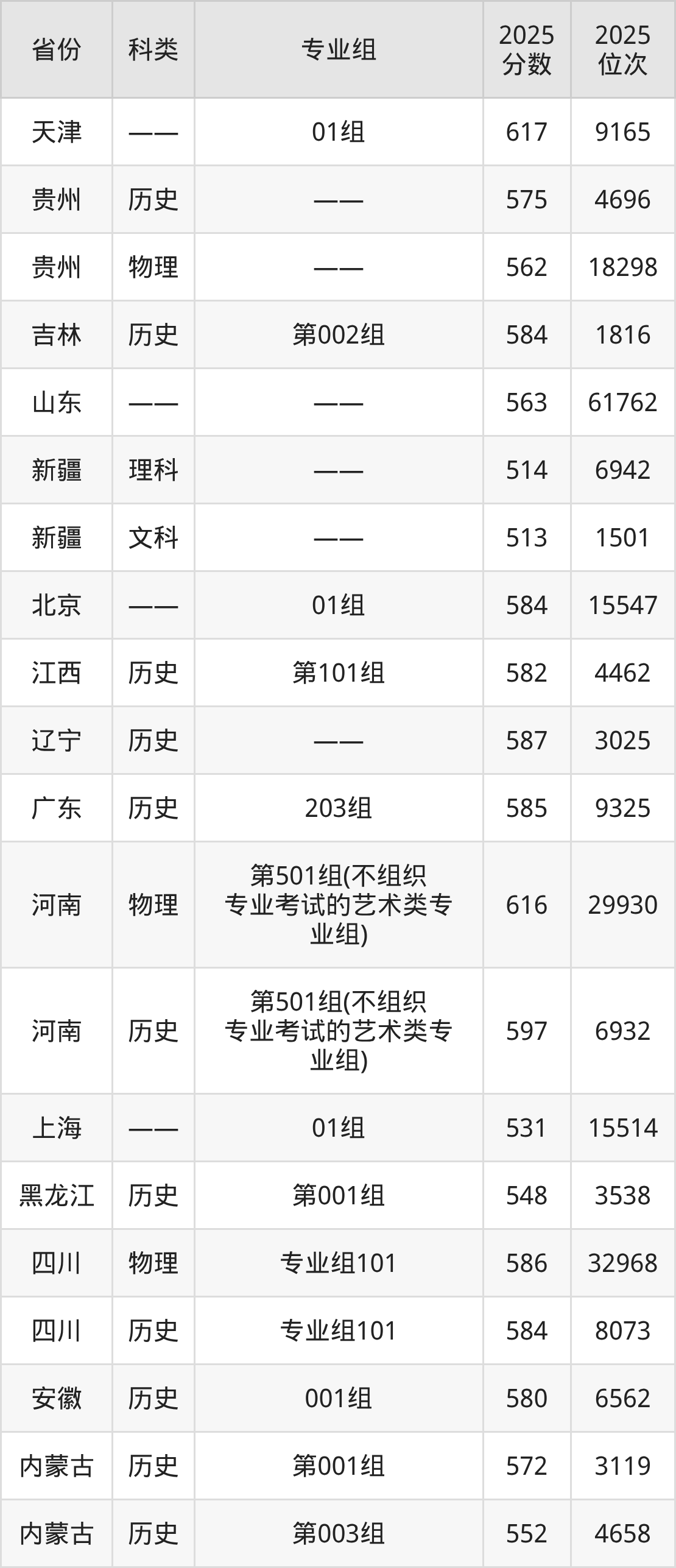 2025上海戏剧学院在各省录取最低分在513分到617分之间不等,其中分数门槛最低的是新疆,最高的是天津。下面展示上海戏剧学院录取分数线最低的5个省份(含最低分专业组及位次):