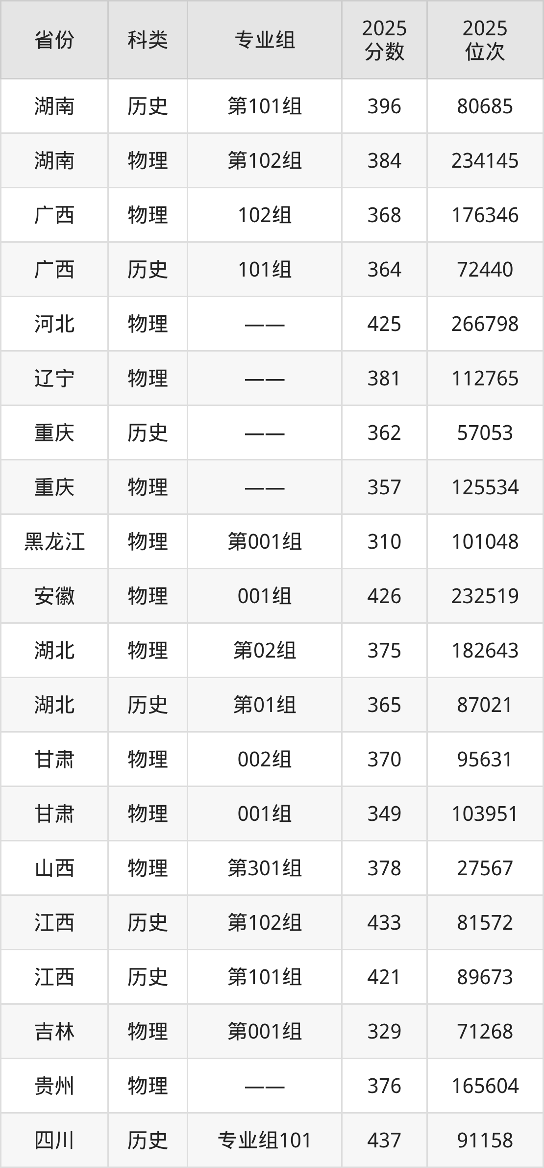 4、甘肃:最低分349分,对应最低分专业组为物理类001组,位次103951名;