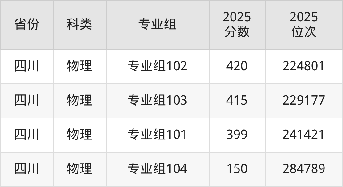 1、四川:最低分150分,对应最低分专业组为物理类专业组104,位次284789名;