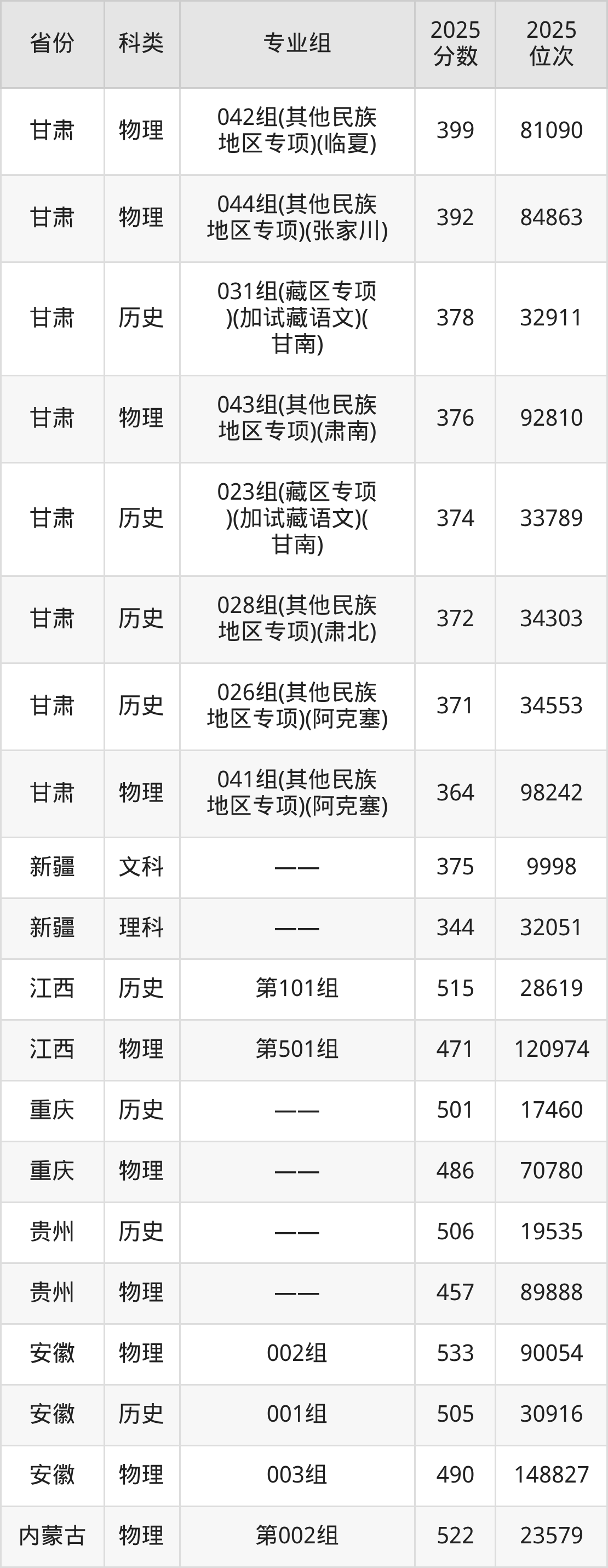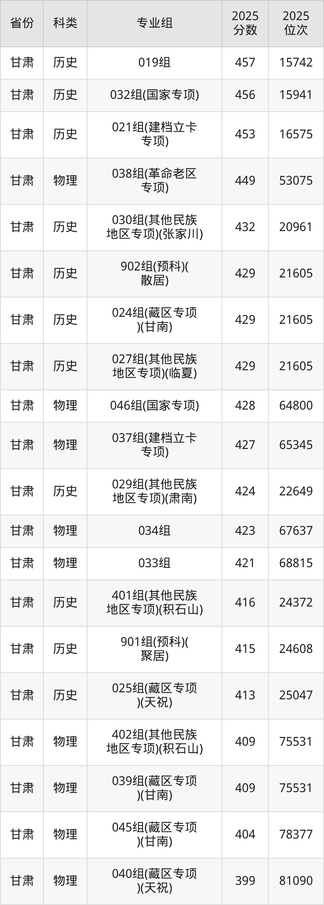 2、甘肃:最低分364分,对应最低分专业组为物理类041组(其他民族地区专项)(阿克塞),位次98242名;