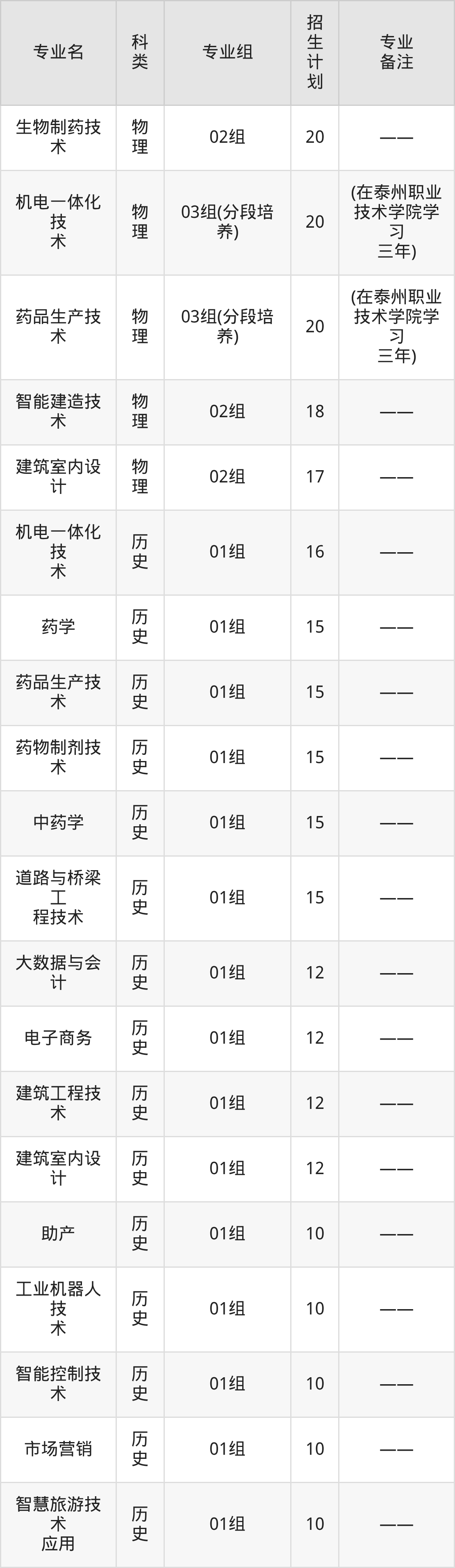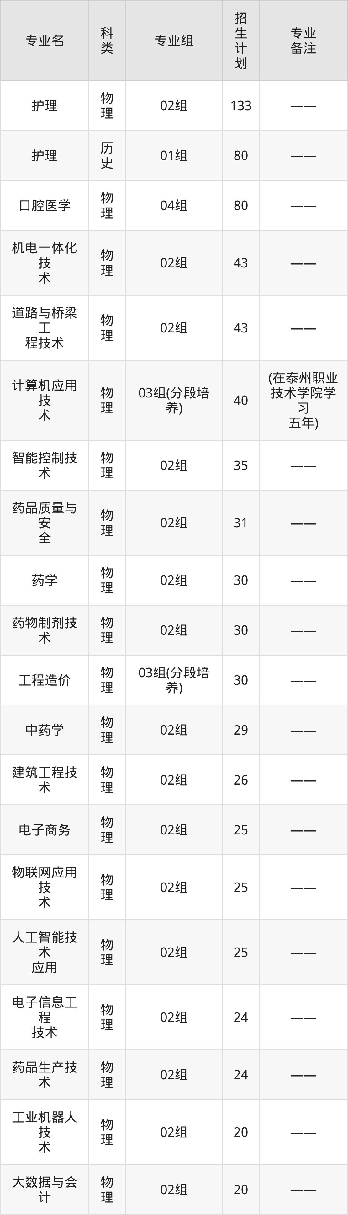 值得注意的是,泰州职业技术学院在专科批招生,招生类型为物理类、历史类。篇幅有限,这里仅附上泰州职业技术学院在江苏省内招生计划详情: