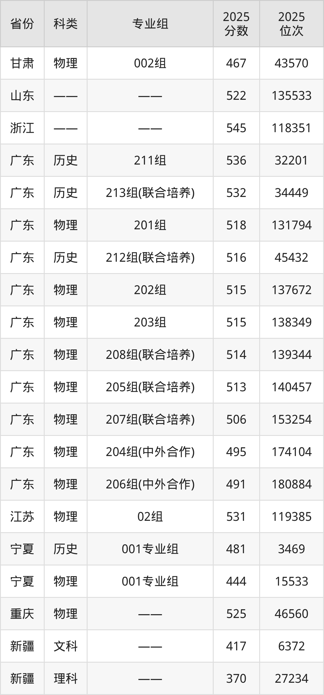 4、广东:最低分491分,对应最低分专业组为物理类206组(中外合作),位次180884名;