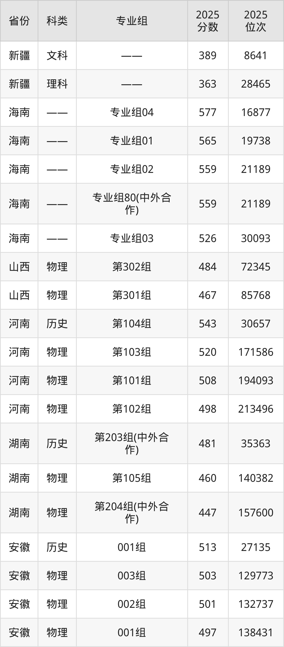 5、湖南:最低分447分,对应最低分专业组为物理类第204组(中外合作),位次157600名;