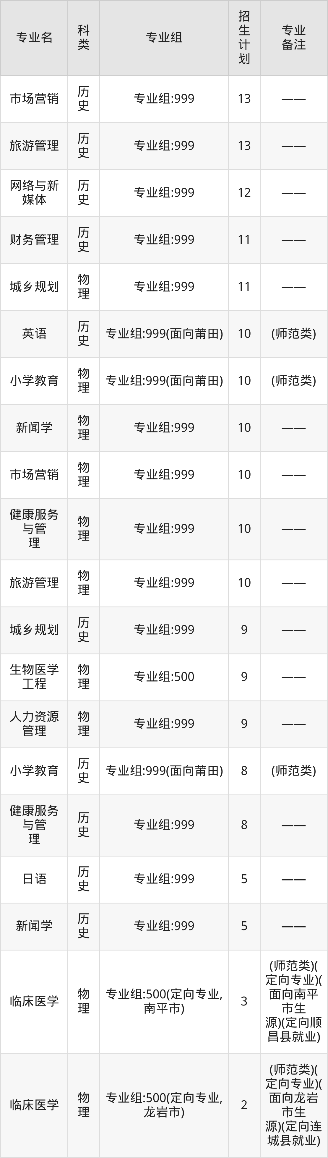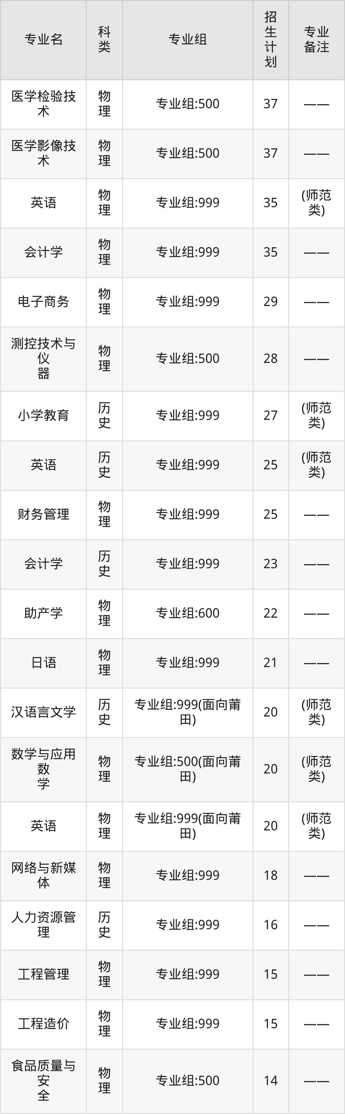 值得注意的是,莆田学院在本科批、本科提前批招生,招生类型为物理类、历史类。篇幅有限,这里仅附上莆田学院在福建省内招生计划详情: