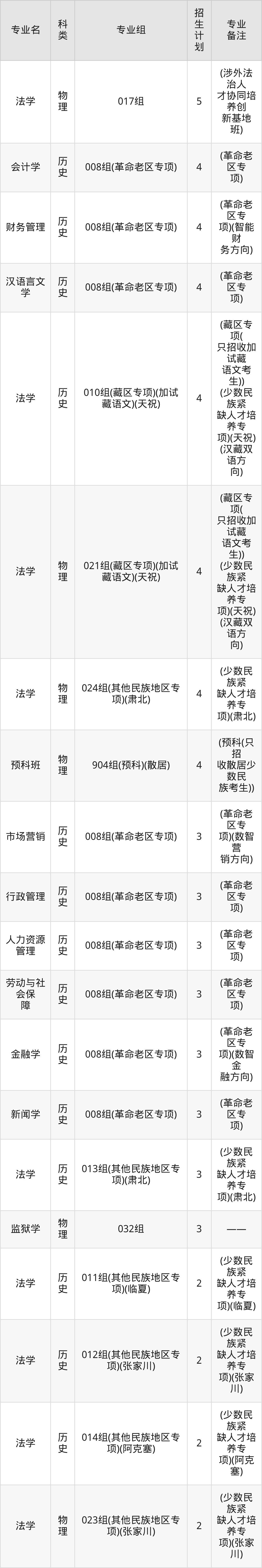 值得注意的是,甘肃政法大学在本科批、本科提前批招生,招生类型为历史类、物理类。篇幅有限,这里仅附上甘肃政法大学在甘肃省内招生计划详情: