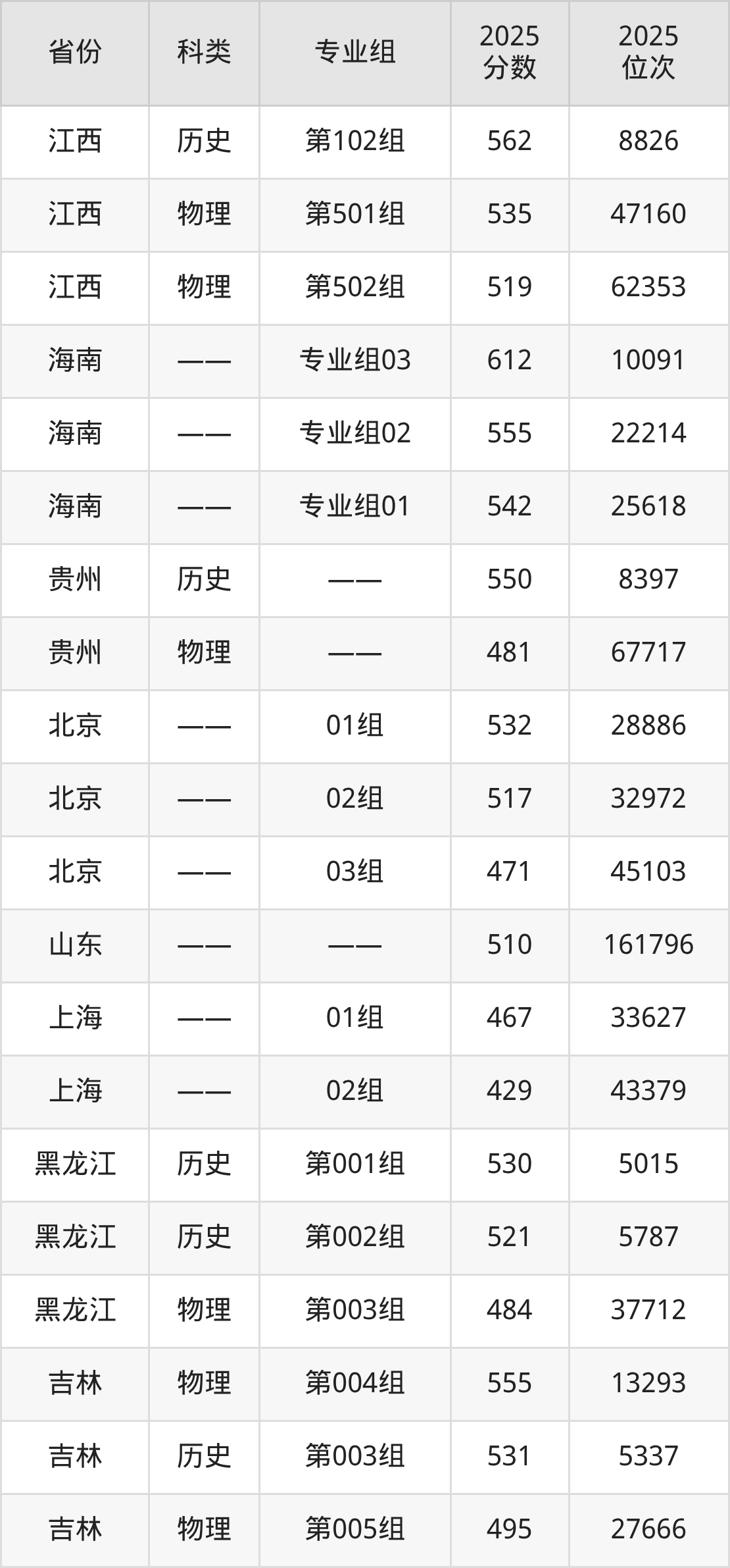 5、北京:最低分471分,对应最低分专业组为03组,位次45103名;