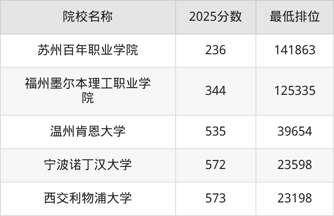 第二梯队(341-549分):苏州百年职业学院(404分)、温州肯恩大学(535分)
