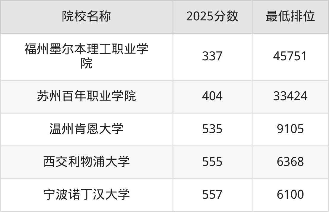 第二梯队(241-569分):福州墨尔本理工职业学院(344分)、温州肯恩大学(535分)