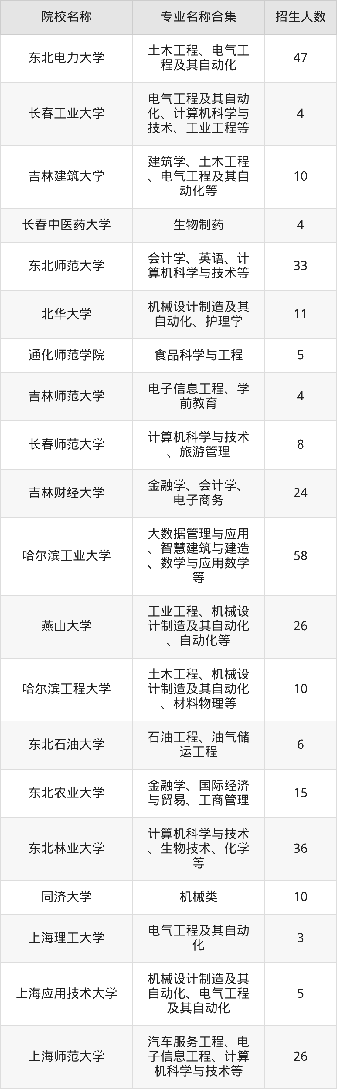 吉林:吉林大学、延边大学、长春理工大学、东北电力大学、长春工业大学、吉林建筑大学、长春中医药大学、东北师范大学、北华大学、通化师范学院、吉林师范大学、长春师范大学、吉林财经大学、吉林外国语大学、长春工程学院、吉林农业科技学院、长春大学、长春财经学院、吉林医药学院、长春金融高等专科学校、长春师范高等专科学校