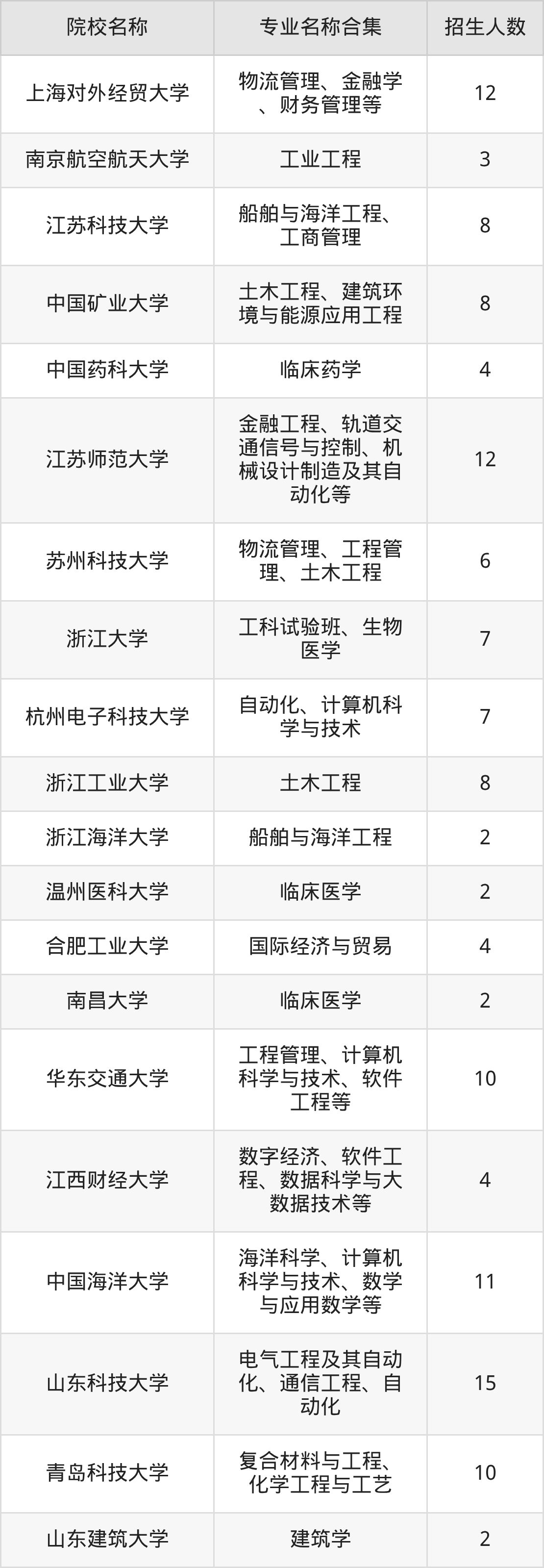 浙江:浙江大学、杭州电子科技大学、浙江工业大学、浙江海洋大学、温州医科大学、浙江财经大学、宁波大学、浙江传媒学院、宁波诺丁汉大学、温州肯恩大学